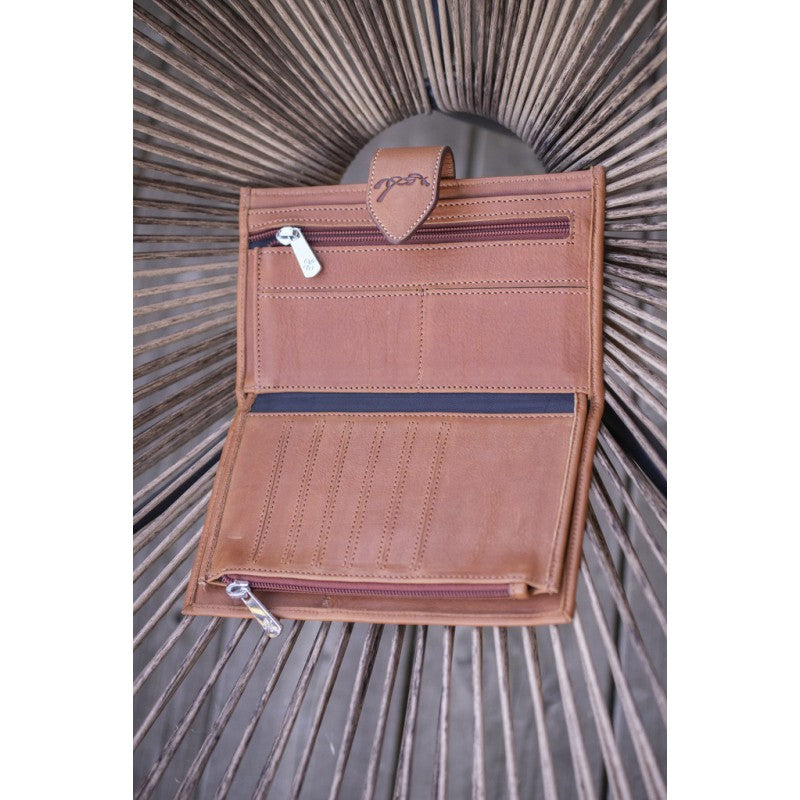 Penelope Bertille Wallet - chic leather wallet with three sections and many compartments to store all your essentials. Made of perforated leather, it has many card slots, zipped pockets for coins, and large openings for checkbook or other important papers. It closes with a leather flap with a snap button. A pretty Penelope logo on the flap adds the final Penelope equestrian touch.