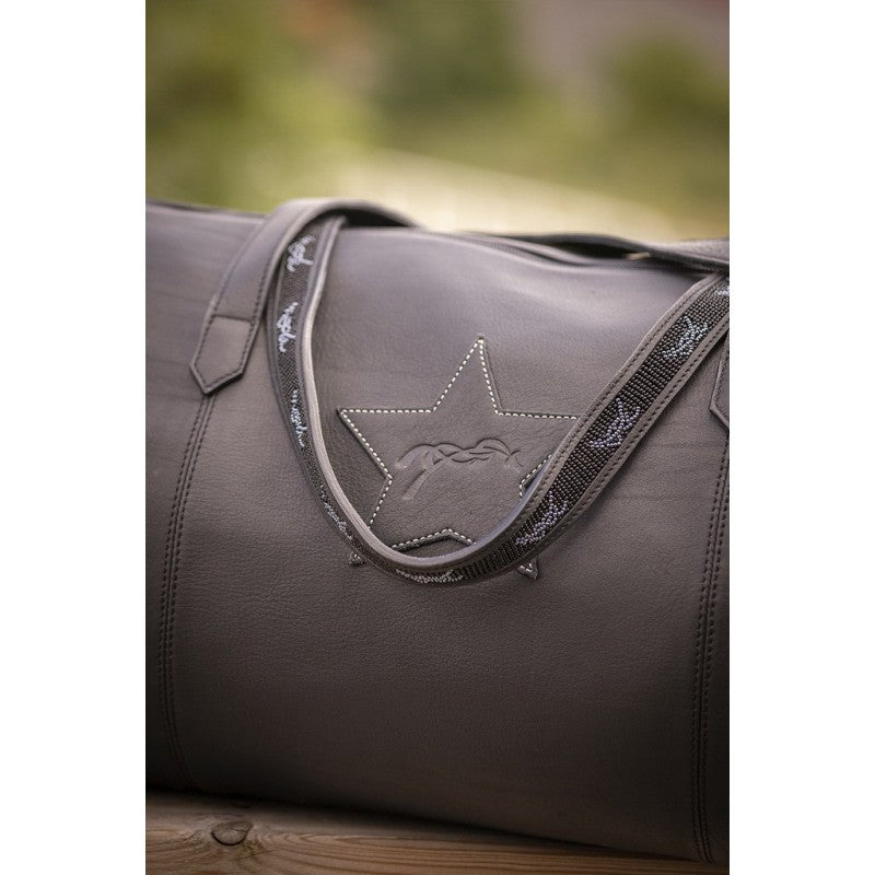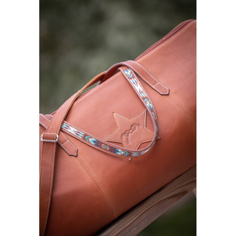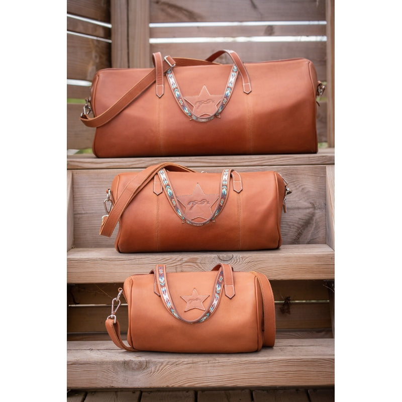 Penelope Large Bowl Bag - made of quality leather, this travel bag is very French chic and practical. The handles come in the classic Penelope pearls style. The brandy colored bag matchs the Penelope pearl belt and the black version matches the Pearlog Belt. The long should strap can be easily removed thanks to the hooks on both sides. The star shaped patch with Penelope log on the center front gives it the essential Penelope look. The inside is lined with beige cotton fabric and has one sipped pocket.