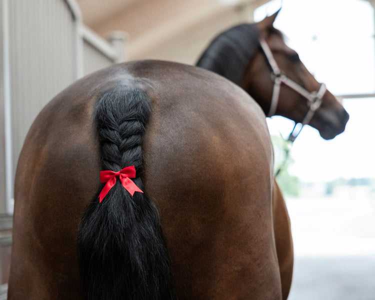 Kingsland KLDaisy Red Bow - this brilliant red ribbon is designed to easily be tied into your horses tail, the bridle or the fly veil to let other riders know that they should keep a distance from your horse from the front or behind. Ideal for shows, the ribbon features an elastic band making it quick and easy to tie into the tail.