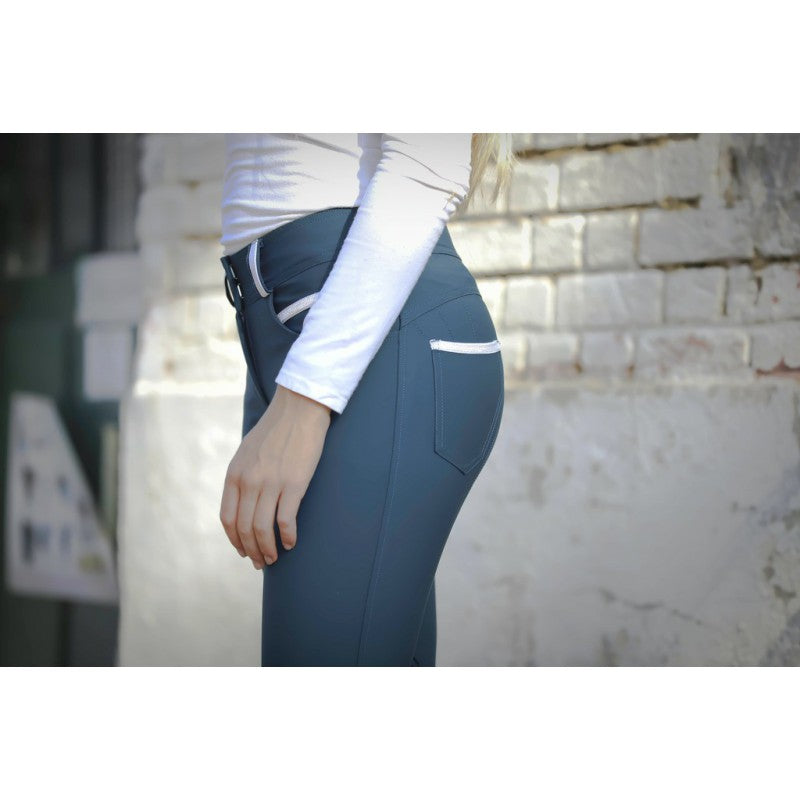 Penelope Women´s Breeches Fun Peacock Blue - comfortable and practical women's breeches with silicone knee patches. The sporty breeches feature silver lurex detailing around the pockets and belt looks for a great look. The mid waist with slight push up effect ensures a brilliant fit and superior comfort. The lower leg is made of Lycra to fit all leg sizes and reduce bulk under boots and chaps.