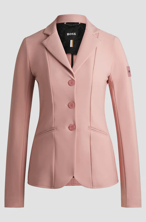 Boss Equestrian Ladies Competition Jacket Anna - a stylish women's show jacket in a classic cut for a polished look in any arena. This competition jacket is in the true BOSS style with gunmetal buttons, signature stripe flag on the collar and a Boss logo patch on the sleeve. The ultralight material is highly breathable as well as offering plenty of stretch to ensure a perfect tailored fit as well as complete freedom of movement when competing. Freejump Airbag Compatible, the jacket can be worn with a Freejump Airbag vest under it. With a 3 button front and double rear vent it's the perfect jacket for both the show jumping and dressage ring.