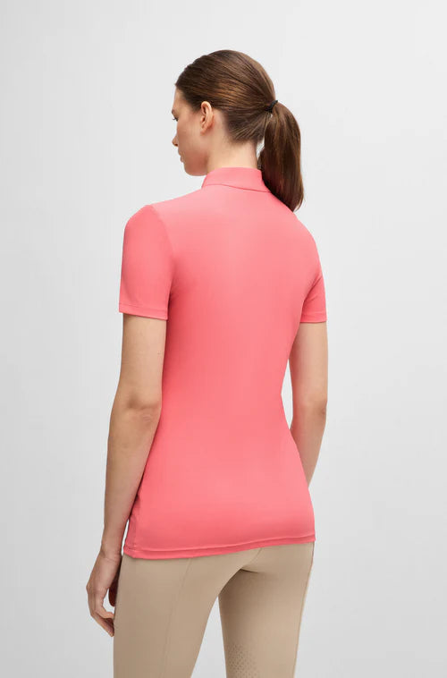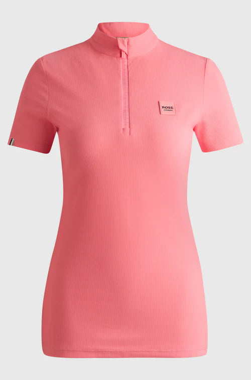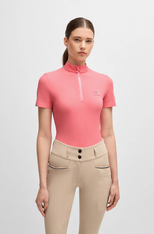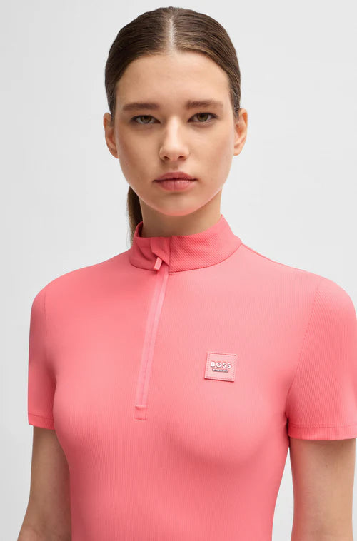 Boss Equestrian Ladies Short Sleeve Training Shirt Maira - a sporty women's short sleeve training shirt with zip front. Ideal for the summer months, this base layer features a zip with BOSS print as well as a Boss logo patch for a classic Boss look. The power sports fabric has a ribbed look, ensuring a unique look in the saddle. Perfect for the summer months, this shirt will complement any of your riding outfits.