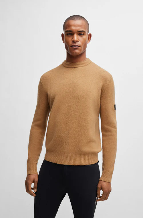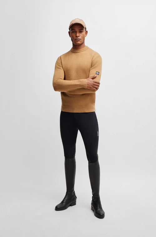 Boss Equestrian Luxury Knitwear Jumper Rayn - this luxury men's cashmere pullover will add style to your riding or casual outfit. The hairy, knitted structure gives it a great look as well as offering superb comfort. The ribbed collar, waistband and sleeve cuffs ensure a perfect fit, whilst the subtle BOSS logo on the left sleeve adds the essential Boss look. A must have for the style conscious male rider.