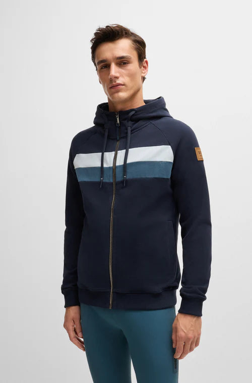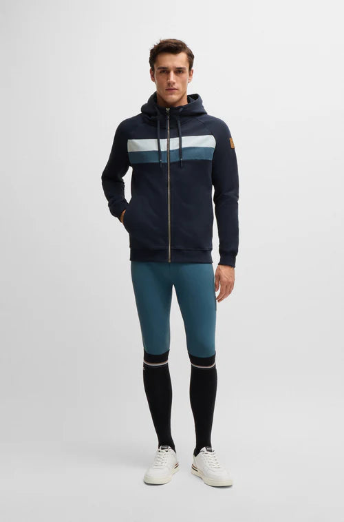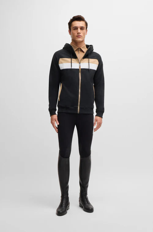 Boss Equestrian Men's Zip Hoodie River - this sporty men's hooded sweat jacket from Boss Equestrian is perfect for riding in or wearing casually with jeans. Designed with contrasting colored stripes on the chest in the signature Boss look, the sweater also has the BOSS logo patch on the left sleeve. Made from super soft Italian sweat fabric with stretch and a brushed inside for further comfort, it's a hoodie you'll love wearing both at the stable and home.