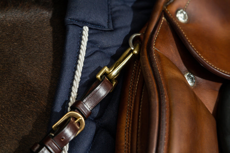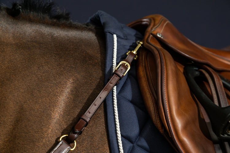 Dy'on Breastplate - a stylish breastplate from the D Collection. It is a classic three-point breastplate with snap hooks for an easy attachement and two additional rings for other aids you might need. The leather is slightly square-raised with a cream coloured topstitching.