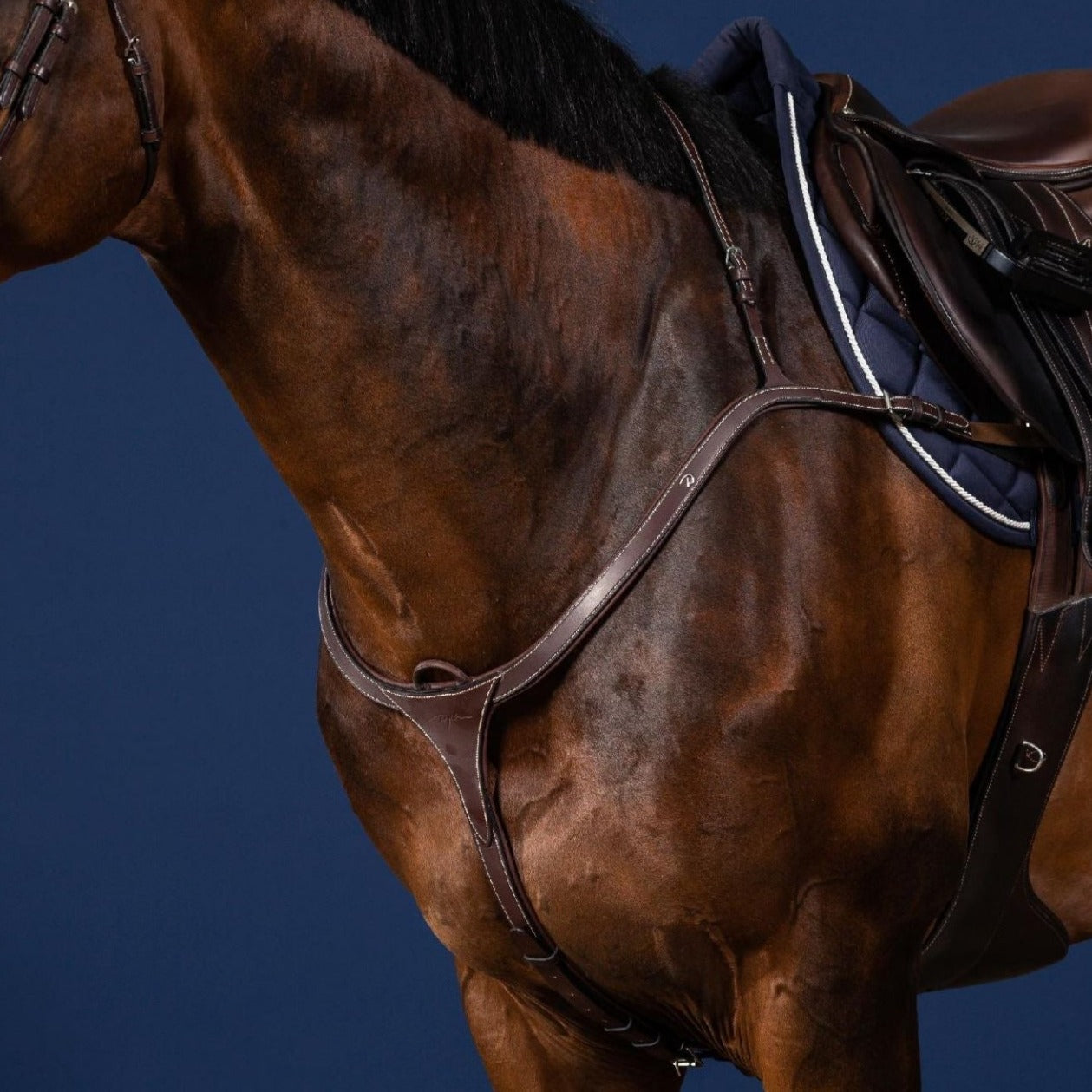 New English Collection: Sharing the technical properties of the D Collection, the New English Collection features silver fittings and stitching that matches the leather color. Popular among high-level riders, this collection combines discretion, quality, and comfort. With the same S-shaped headpiece, it's versatile across equestrian disciplines and horse breeds.