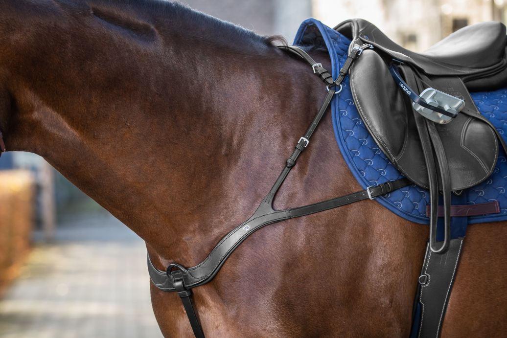 - 4 or 5 attachment points: 2 at saddle rings – 2 at girth straps – 1 removable under girth (to change the breastplate into a breast collar)