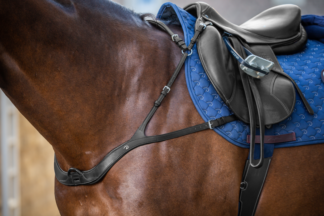 Dy'on New English Anatomic Breastplate - a breastplate specifically designed to allow complete freedom of movement of the horses shoulders for increased performance and comfort. Used by many of the worlds best riders, this ergonomic breastplate conforms to the horses shape to allow the shoulders to move freely and comfortably when jumping as well as on the flat. The 5 points of attachment ensure your saddle remains in place. Easily attach any martingale attachment to your breastplate. The girth attachment is also fully removable turning the breastplate into a 4 point breastplate and allowing even further freedom of movement. It is the perfect choice for both show jumping and eventing riders thanks to its brilliant design.