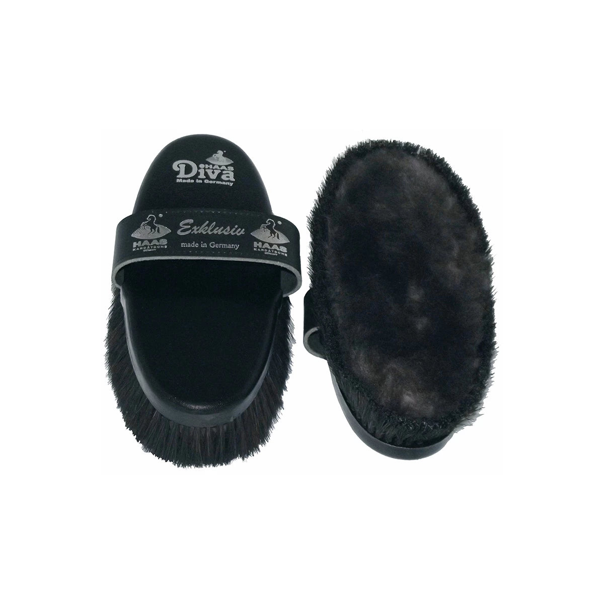 Haas Body Brush Diva Exclusive - this super soft sheepskin brush for a shiny finish. This brush features lambskin surrounded by black horse hair for the perfect look. A black leather wrist loop is attached on the back. Made in Germany.