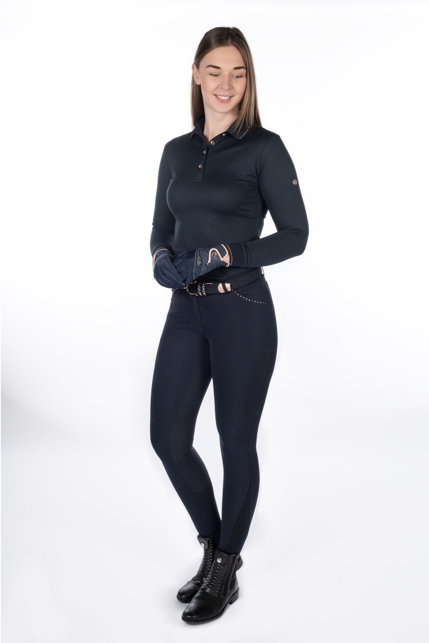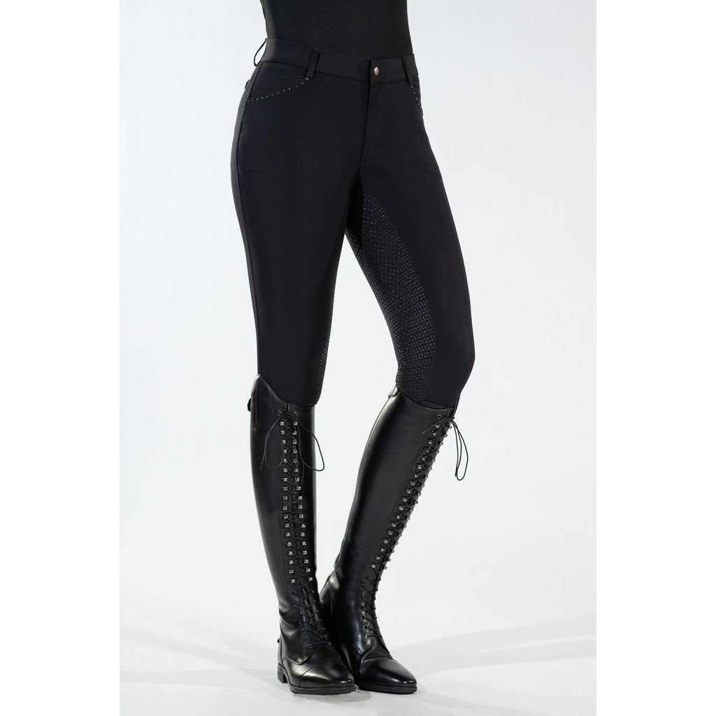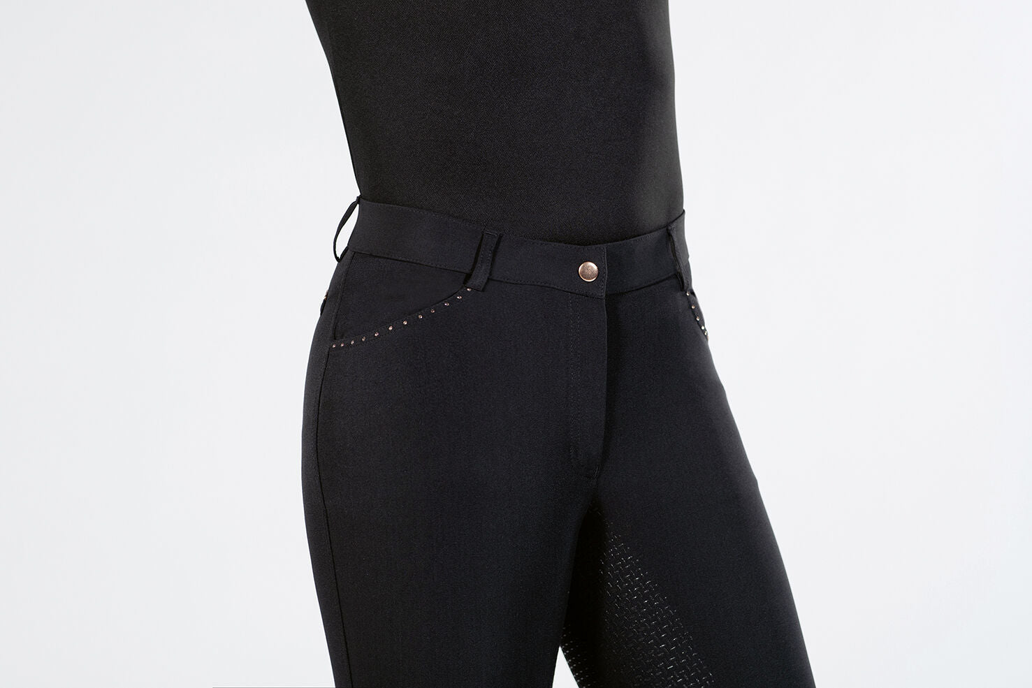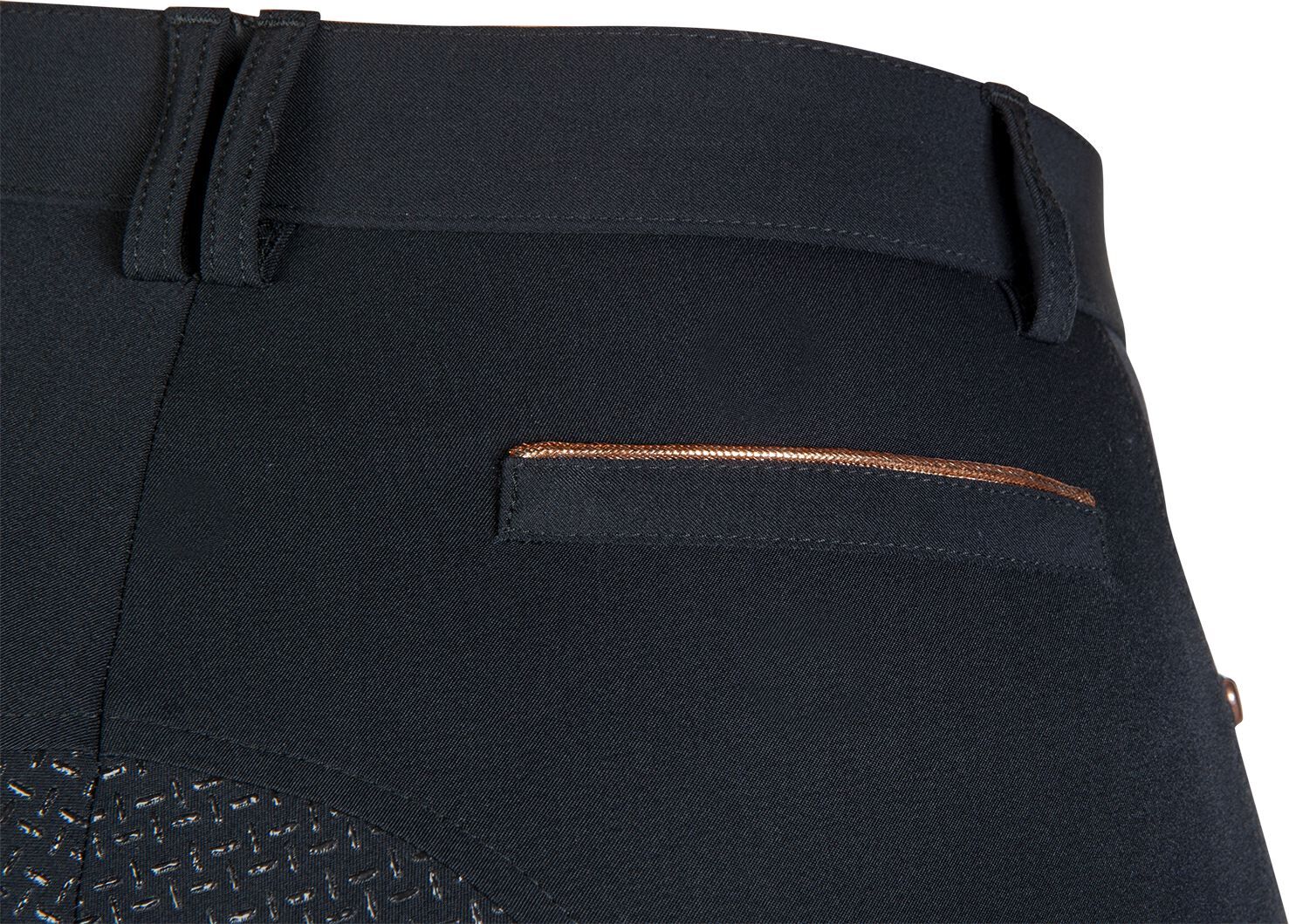 HKM Women´s Breeches Rosegold Glamour Style with Full Silicone Seat  - these incredibly stylish and affordable women's full seat riding breeches are a true eye catcher. Striking rose gold detailing along the front and rear pockets as well as a rose gold button combines beautifully with the black colouring of the breeches The full silicone seat adds the perfect amount of grip in the saddle whilst the elastic ankles help to reduce bulk under your boots or chaps.