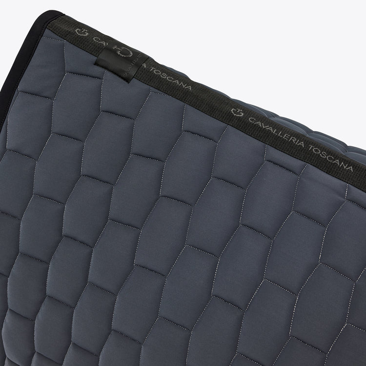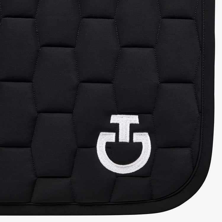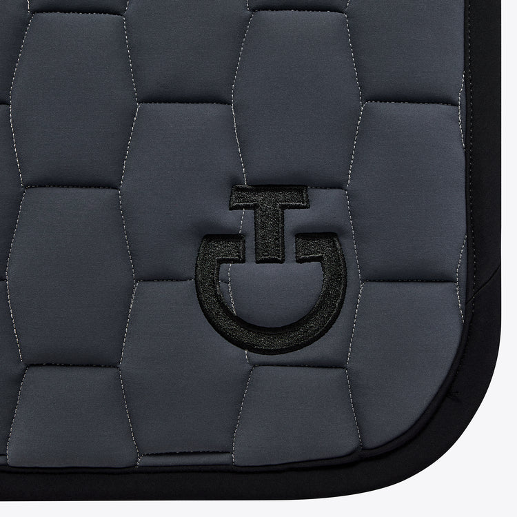 Cavalleria Toscana CT Geometric Quilted Saddle Pad - this brilliant dressage saddle blanket offers exceptional comfort and style. The geometric quilting gives the pad a unique look, while the embroidered logo on the left side adds an essential CT touch. Antibacterial waffle texture fabric on the inside ensures the pad is highly breathable as well as incredibly soft on your horse's back. Anatomically cut for superior fit and comfort, the pad is refined with a contrasting colored edging for a sophisticated look. The perfect pad for daily training or wearing at competitions!