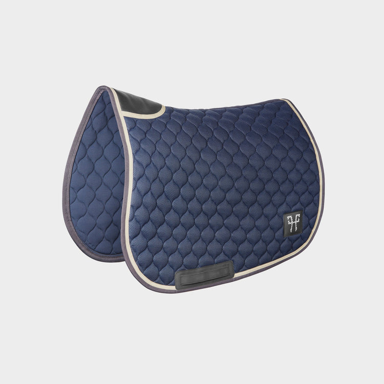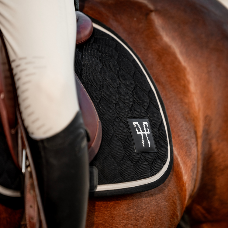 Horse Pilot Saddle Pad - a brilliant saddle blanket designed with your horses comfort in mind. The 3D mesh material ensures that the saddle pad remains lightweight and highly breathable. The anatomic shape adapts perfectly to the horses back for a perfect fit whilst the elegant faux leather on the withers not only looks great but adds wither protection. Lined with poly-knit mesh fabric on the underside for a soft touch on your horses skin, the saddle blanket is finished off with contrasting colored binding and piping for a fancy look as well as a small Horse Pilot logo. A brilliant saddle blanket for daily use or as your competition saddle pad.