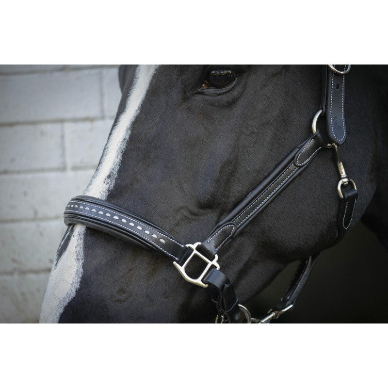 Penelope Point Sellier Leather Halter - this stylishly designed leather halter has a padded, anatomic headpiece for extra comfort. The beautiful Point Sellier stitching combines perfectly with the patent leather tone-on-tone piping to give the halter it's elegant looks. The throat latch and connecting strap are fully removable to turn the halter into a grooming halter. Adjustable on both sides, the halter can be changed to get the perfect fit on your horse.