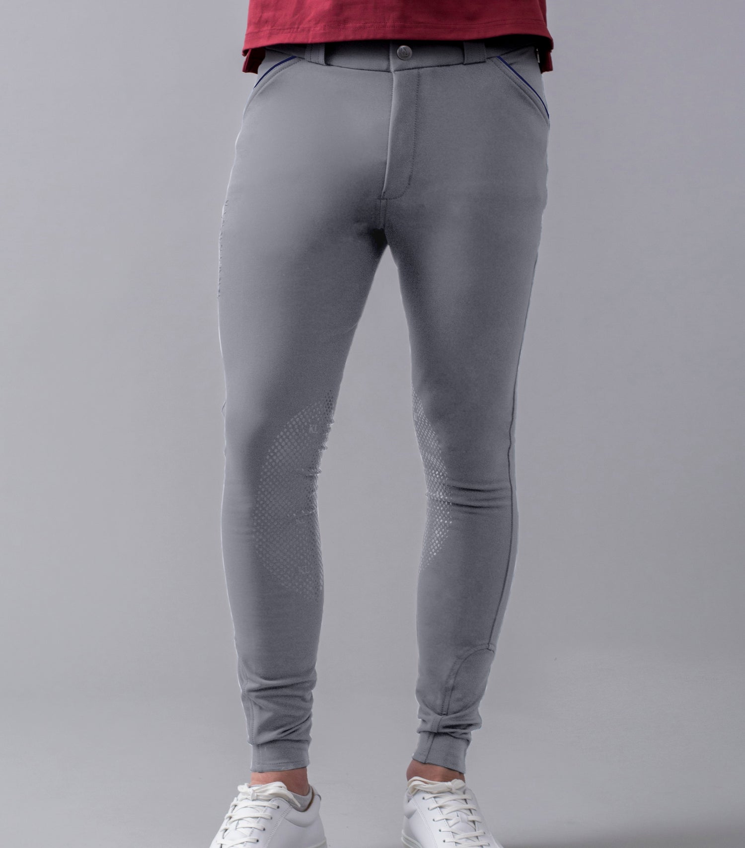 Men's Breeches with E-Tec Knee Grip KLKenton - comfortable men's riding breeches with silicone knee patches for ideal grip in the saddle.  Designed with comfort and performance in mind, these high quality breeches are made from soft technical fabric which offers powerful 4-way stretch as well as remaining breathable. The striped piping on the front pockets adds a subtle touch of Kingsland detailing which combines perfectly with the embroidered Kingsland logo on the back as well as the Kingsland patch on the thigh. A must-have for the competitive rider, these light grey breeches are sure to become a favorite.