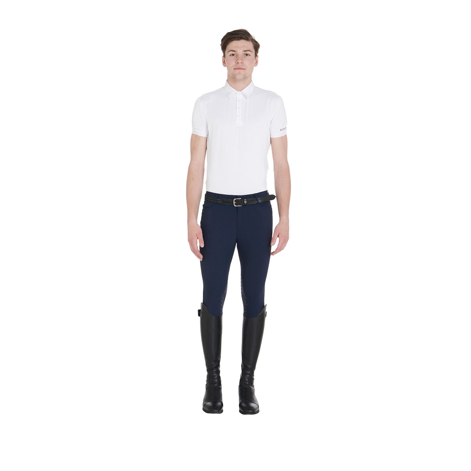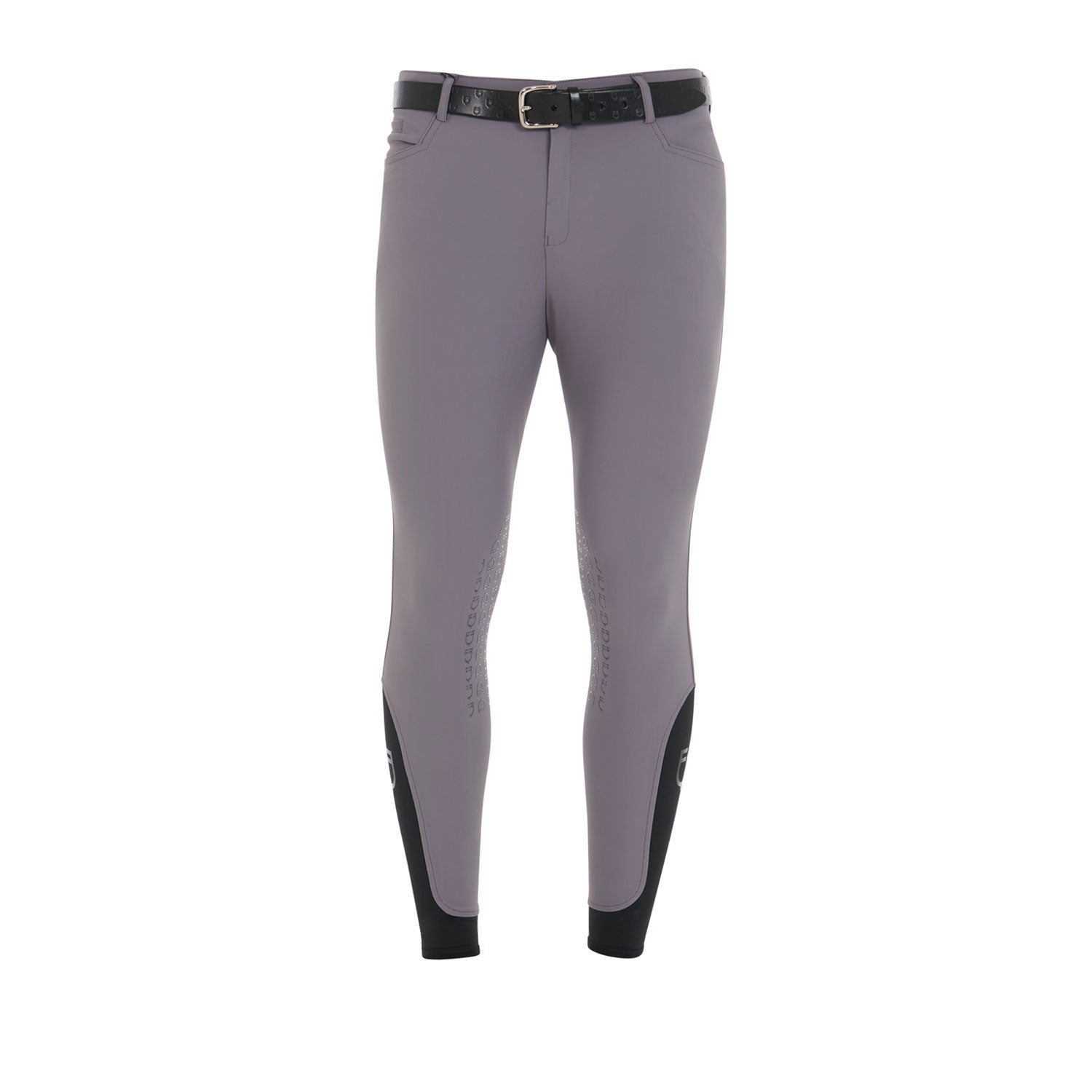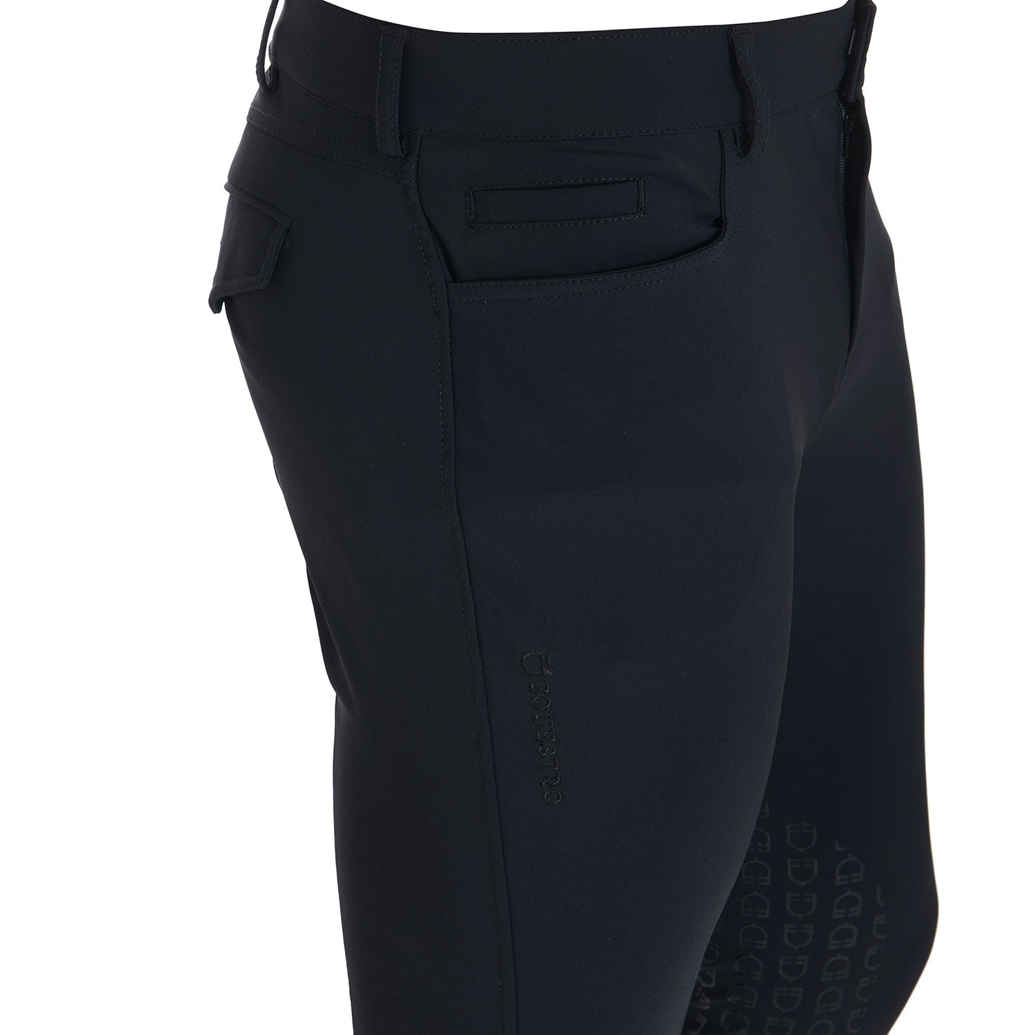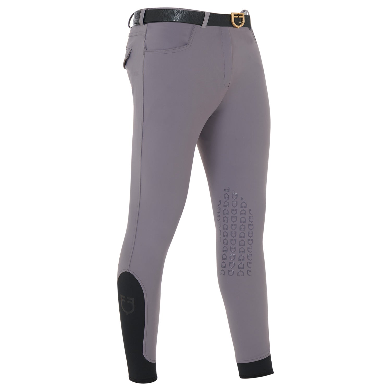 Equestro Men's Summer Breeches - these lightweight riding pants are ideal for the warmer months thanks to the bi-elastic, technical fabric which is highly breathable. The lycra insert on the lower leg ensures comfort and less bulk under your riding boots or chaps whilst the silicone knee patch adds the perfect amount of grip in the saddle. The inside of the waistband also has a silicone inner to help keep your shirt tucked in when riding. The flat front offers comfort and great looks.