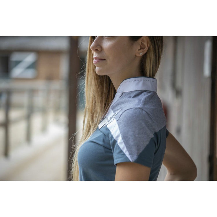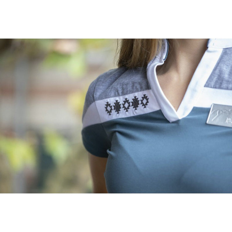 Penelope Indy Polo Shirt - a new polo shirt by Penelope that you don't want to miss! Indy has an ethnic look to it, which is something new and adds a special equestrian look to it. It comes with a short stand up collar, raised by point sellier stitches, a nicely shaped V-neck and a cute feminine cut. The super soft fabric makes it very nice to wear. Which makes it the perfect polo for riding, chilling at the stables or in town.