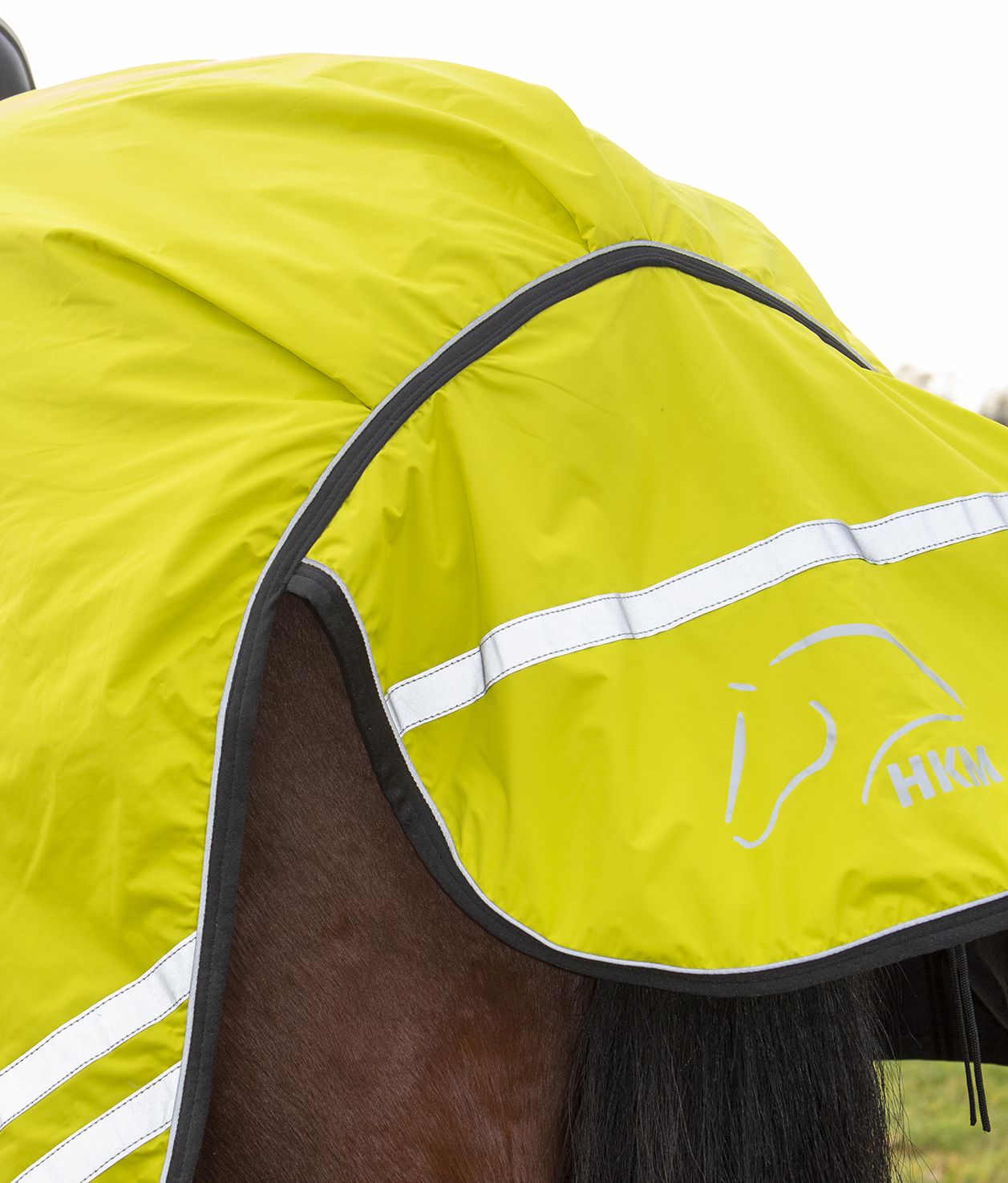 HKM Exercise Sheet Reflective - be seen during the darker months with this bright exercise rug. Waterproof and highly breathable, the rug features warm fleece lining and large tail flap, its the perfect choice for riding in on cooler days. The secure velcro closure at the front and tail strap keep the rug securely in place when riding and hacking out.