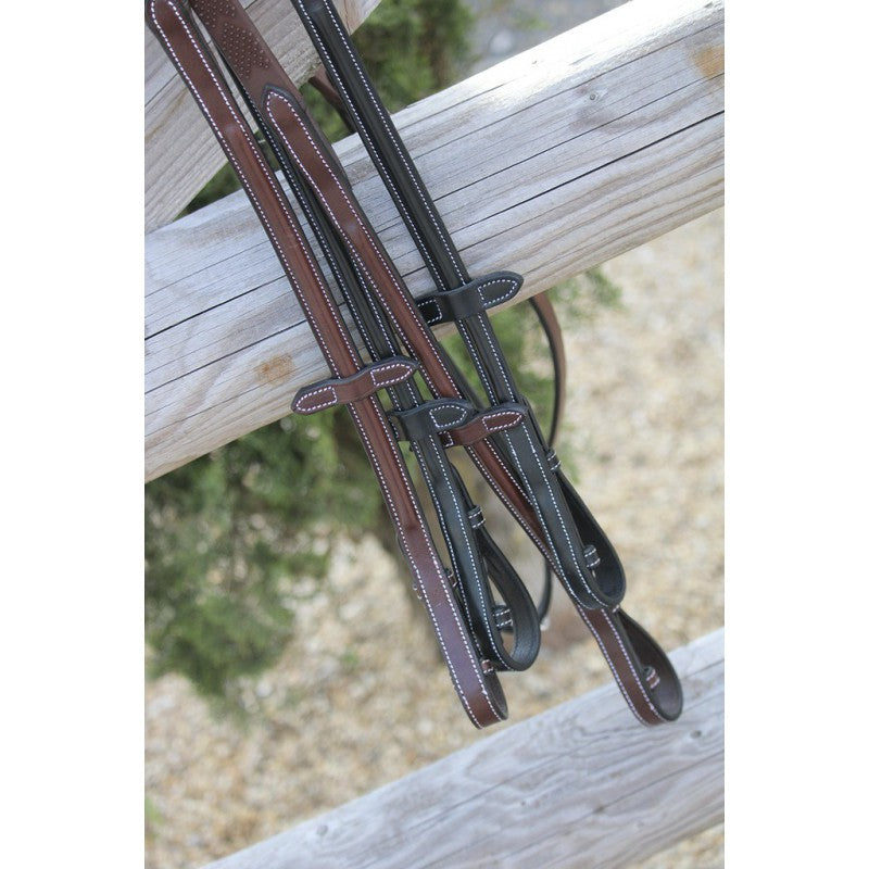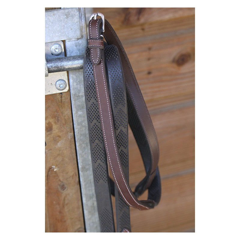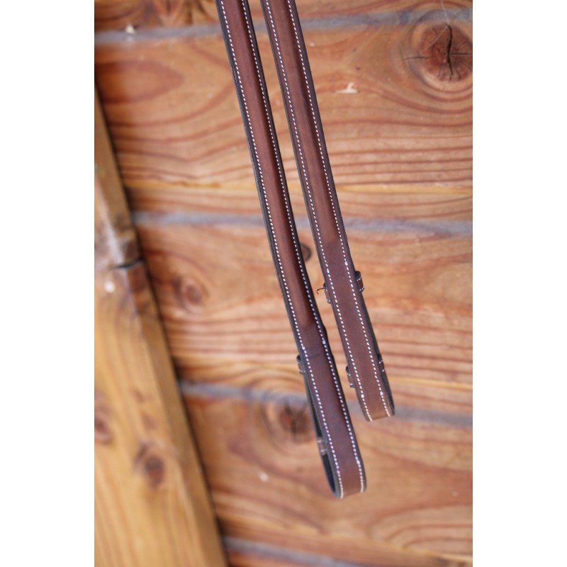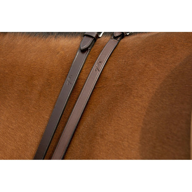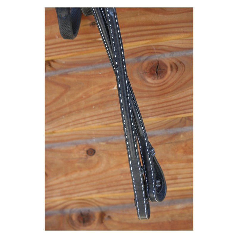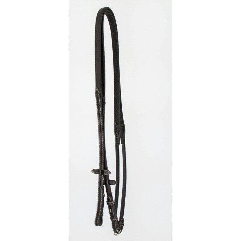 Penelope Rubber Reins Luxe - These luxurious rubber reins match your luxurious bridle ! They are made in the same soft leather as the Luxe bridle, with the matching stitchings and silver colored steel buckles. It has martingale stoppers to stop the (removable) rings from your martingale fork to get stuck in the bit. The emblematic horse logo is designed on the grip.