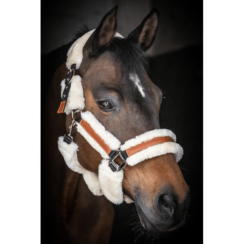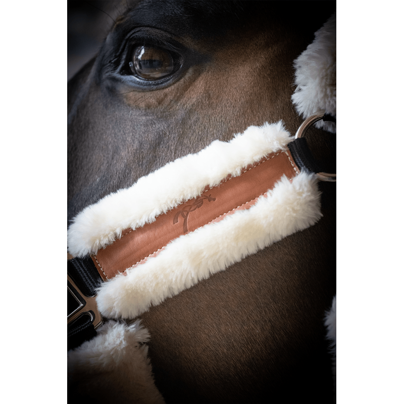 Penelope Soft Halter - nylon halter padded with artificial sheepskin and leather inserts. It's a halter designed for comfort and aesthetics for your horse. The Soft Halter is adjustable on both sides of the headpiece and the noseband. The leather parts on the noseband and on both cheek pieces are surrounded by synthetic sheepskin. Everything else is made of nylon, also covered with this gorgeous vegan sheepskin. The halter is quite flexible, perfect to have it on for your horse during travels, or just for grooming!