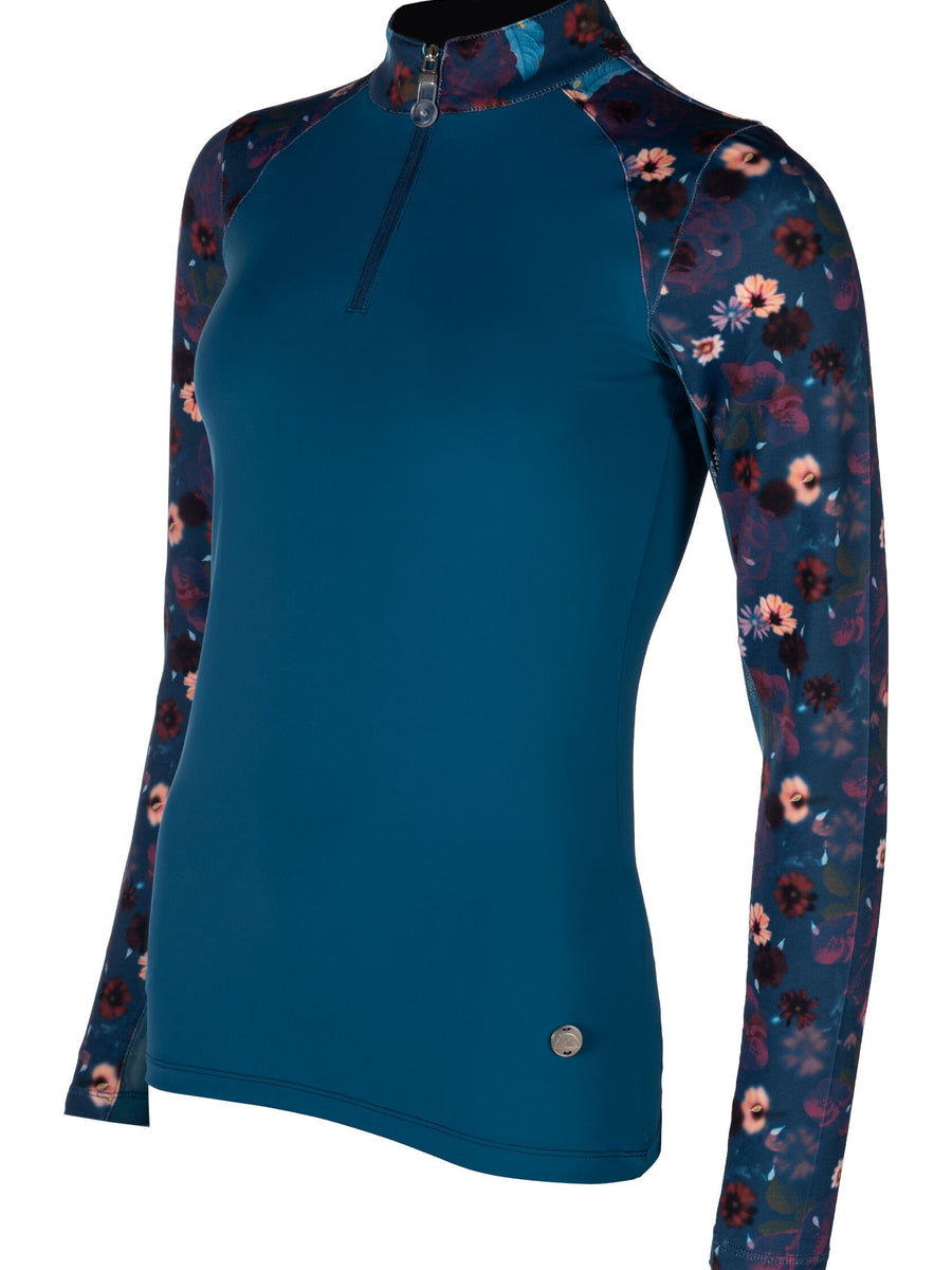 HKM Function Shirt Essential Flowers - stand out from the crowd in this bright and fun equestrian base layer, featuring a flower pattern on the sleeves and collar. Offering UV protection, this shirt is a great choice for all year round. The highly breathable fabric combined with the mesh inserts will help keep you cool on warm days or from sweating under your sweater during the cooler months.