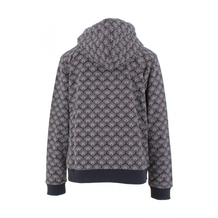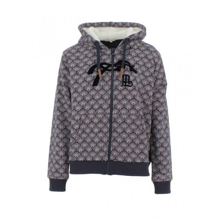 Penelope Rosy Hoodie - this fun print equestrian sweatshirt is great for daily riding or teamed with a pair of jeans. The interesting patterns combine beautifully with the Penelope logo on the chest in velvet navy to create a unique look. The sweater features a large front zip. The waistband and cuff bands are in a solid navy, as well as the thick fleece lining of the hood, which complements the pattern. A great addition to your equestrian and casual wardrobe!