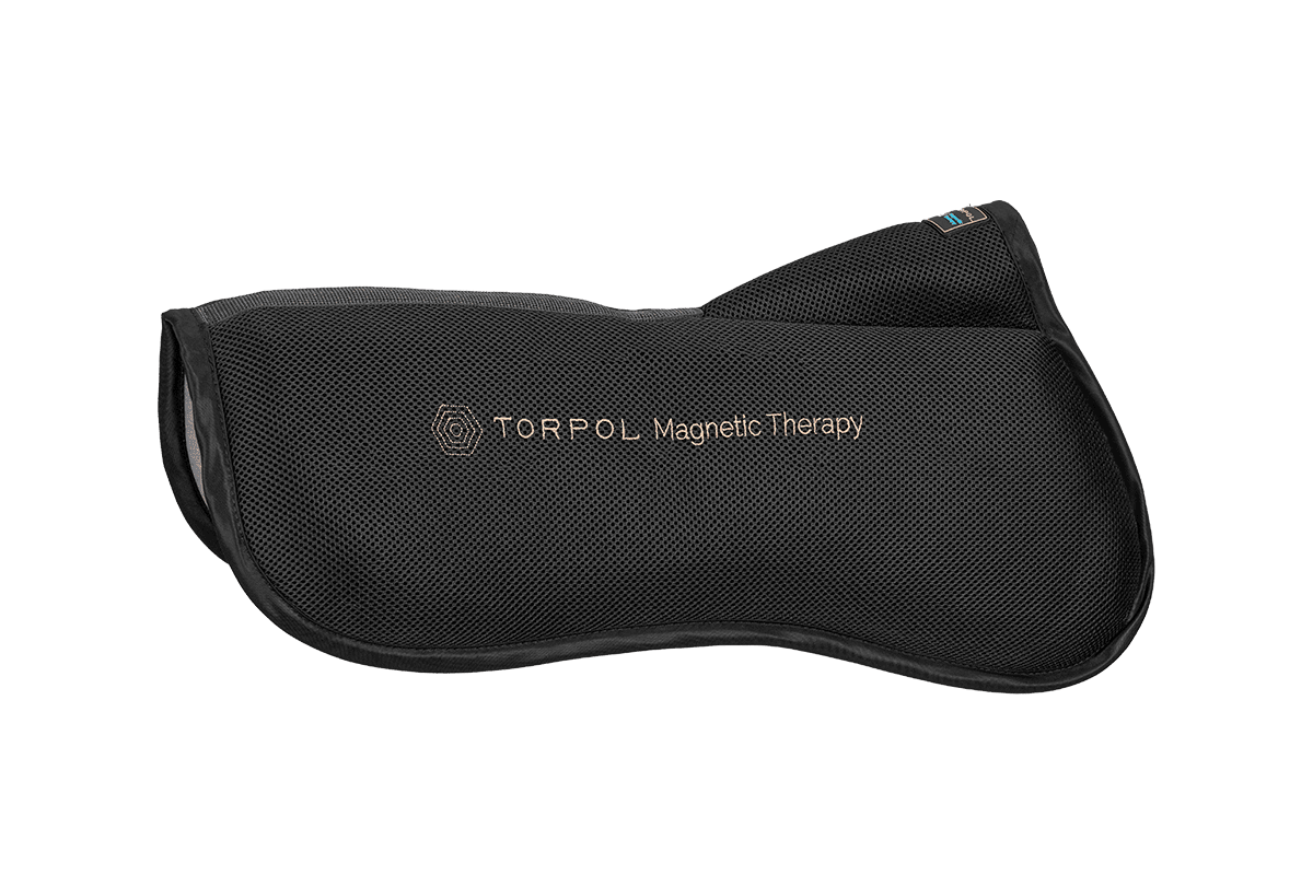 Torpol Classic Latex Magnetic Half Pad - A multi-layer foam system designed to guarantee spinal protection for both horse and rider while integrating magnetic field therapy to enhance back flexibility, stimulate blood circulation, and accelerate muscle recovery. Pressure-related discomfort is evenly distributed and reduced, ensuring a more comfortable ride. The Free Neck System at the withers provides an optimal fit and excellent air circulation. The removable Latex Sponge insert is shielded by a 3D mesh fabric, offering added durability and breathability. The inner lining is breathable, efficiently wicking away sweat to keep the horse cool and dry. Magnetic field therapy positively affects the flexibility of the horse’s back, balancing energy deficits and promoting faster muscle tissue regeneration.