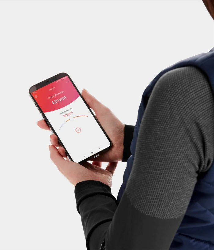 The vest can be activated and adjusted by pressing the control button on the right bottom side of the vest. The temperature can also be adjusted more accurately using the "iwarm3" app.