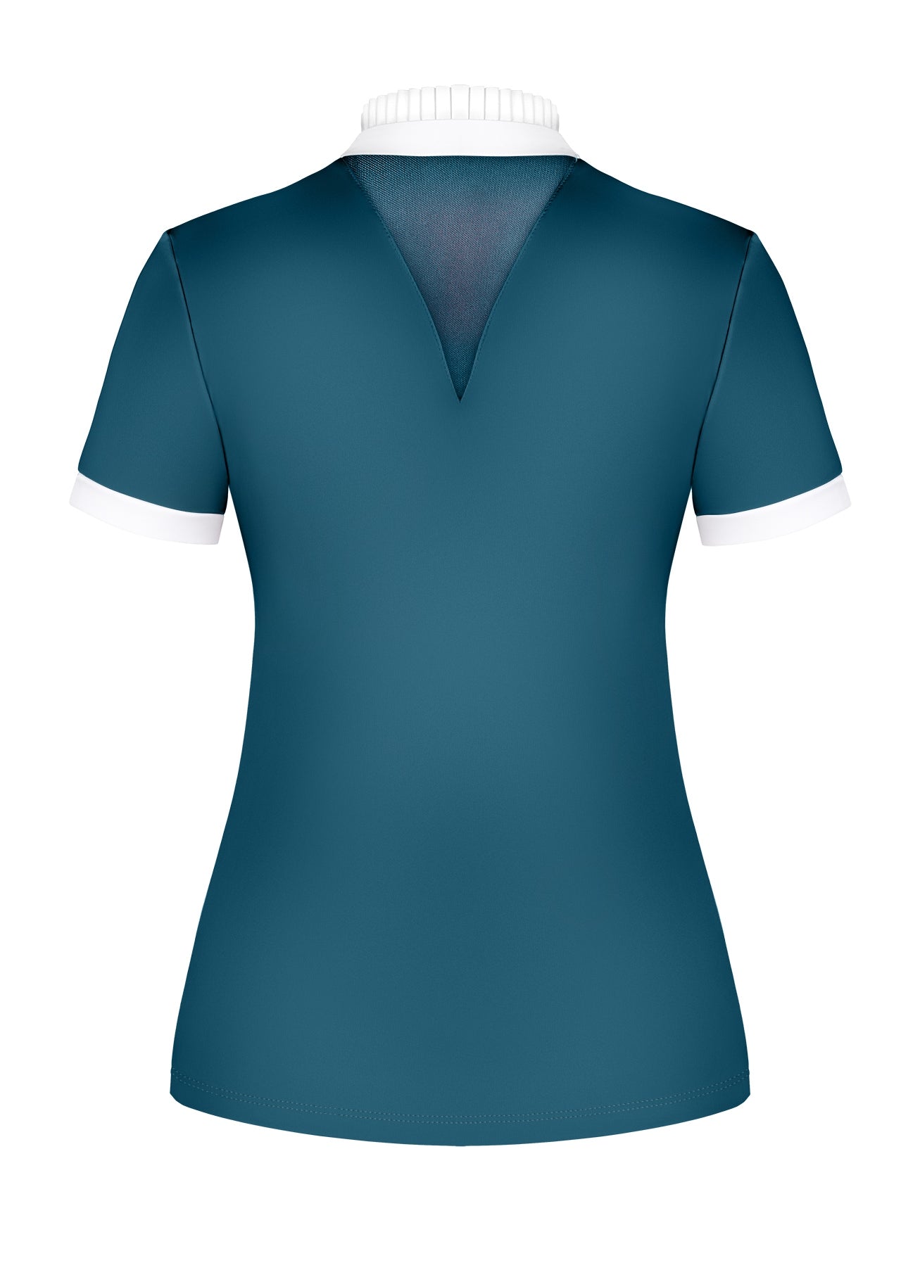Fair Play Competition Shirt Sophie - this gorgeous short sleeve women's show shirt will complement your competition look what ever your discipline. Featuring a ruffled stand up collar, the shirt is incredibly elegant thanks to the elastic mesh inserts on the front and back as well as the delicate crystal details on the front placket. Made from highly breathable elasticated fabric with UVP, it's ideal for wearing during the warmer months. Hidden press stud buttons make it quick and easy to put on.
