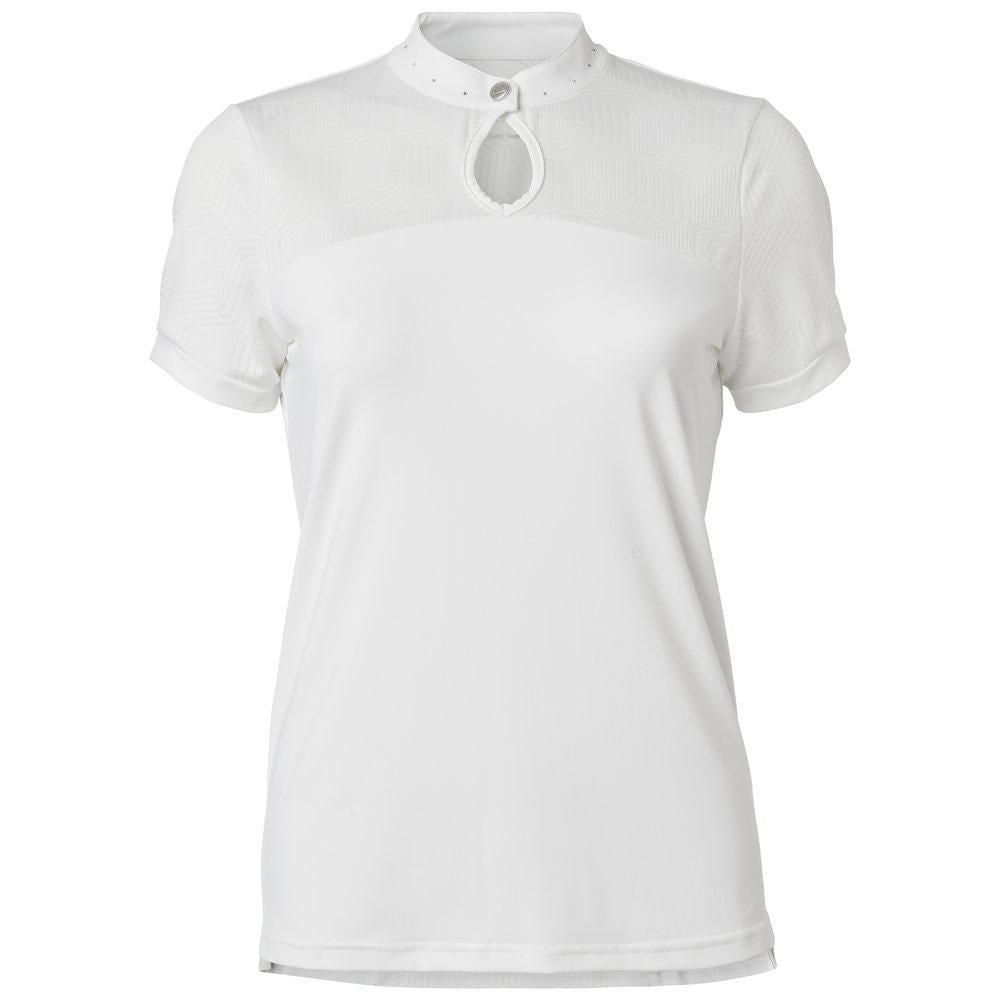 Mountain Horse Jewel Tech Show Shirt - This exquisite show shirt features a slight transparent lace effect, adding a touch of sophistication to your riding attire. Made from advanced cooling fabric, this top excels in moisture-wicking performance, ensuring you stay comfortable and dry during intense competitions or trainings. The decorative beading along the collar provides a unique, eye-catching detail that sets this top apart. Ideal for riders who demand both functionality and fashion for the show.