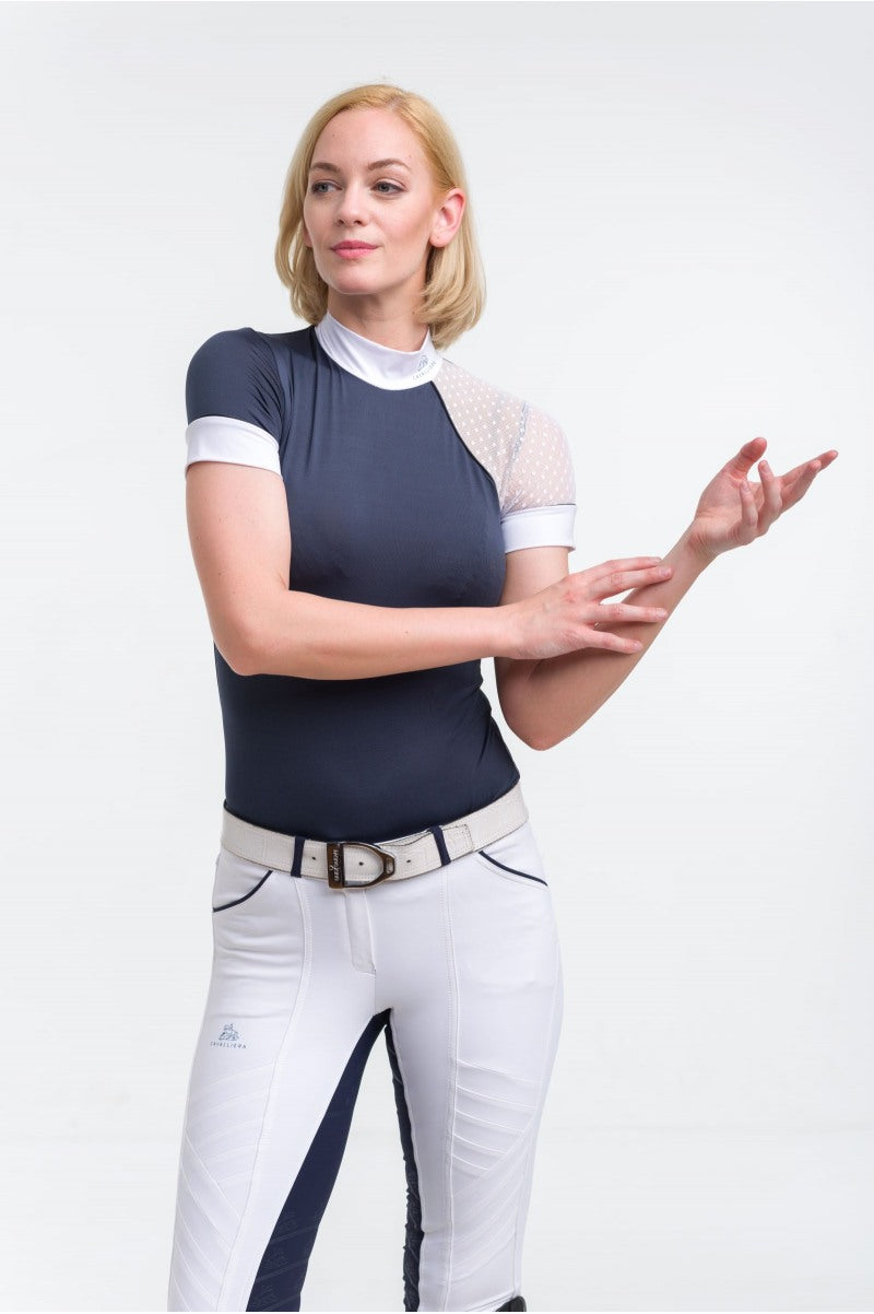 Riding Show Shirt Modern Dame - one of the most versatile pieces, this technical show shirt is a high performance addition to your riding wardrobe. The one-sided raglan-style sleeve, contrasted color piping and branding unites elegance and technology. Built with superior performance materials, the shirt is perfect for competitions. Machine washable and easy to take care of. Features a timeless design and athletic functionality which appeals to riders of any discipline. Wear this extra feminine equestrian show shirt and be a true dame.
