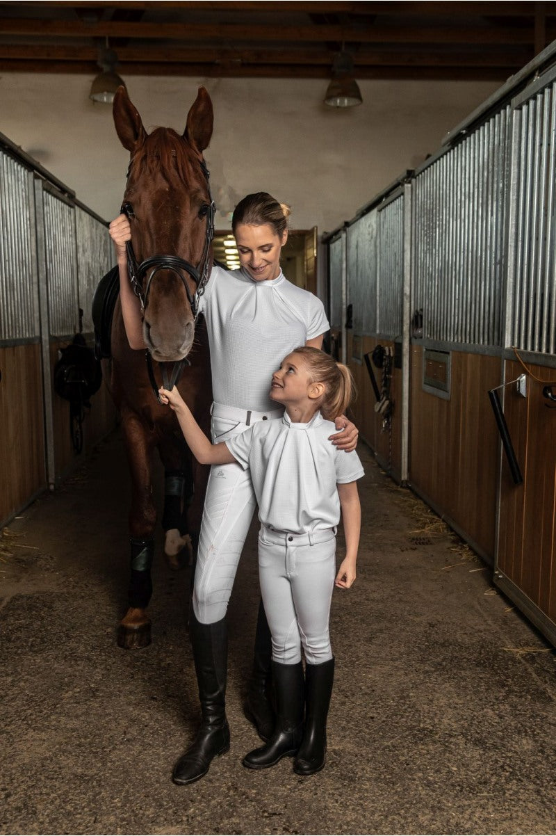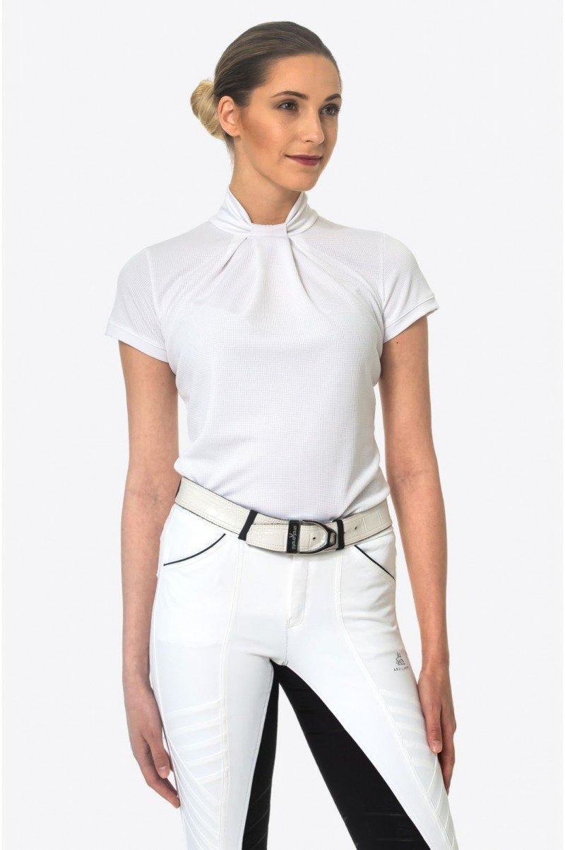 Cavalleria Women´s Short Sleeve Show Shirt Festive - this luxurious competition shirt is made in stretch technical CoolR fabric for ultimate comfort and an impeccable fit. The elegant detailing in the scoop neckline adds a beautiful and unique touch to the shirt. The regular.fit design and the elasticity of the material guarantees all day comfort with maximum freedom of movement.