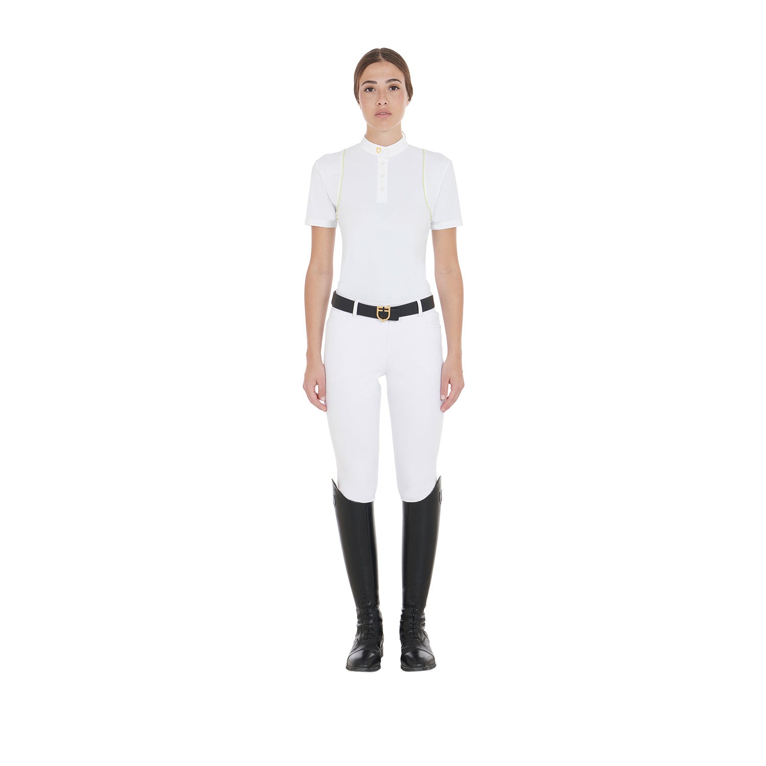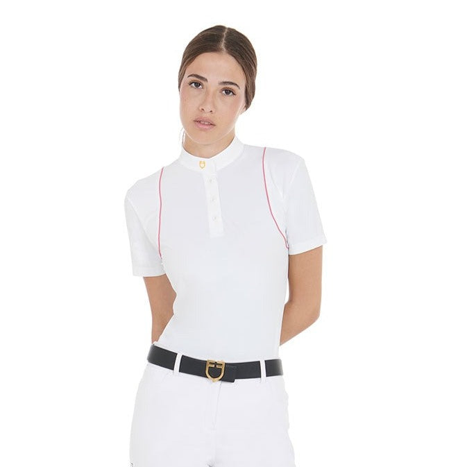 Equestro Women's Competition Polo Shirt - this slim fit ladies short sleeve show shirt is made from quick dry technical fabric with mesh inserts to ensure your comfort on warm competition days. The fresh and feminine design makes it the perfect choice for competing in during the summer months. The shirt features classic button closure and cotton standing collar with an Equestro logo. The contrasting piping details make the polo elegant and trendy. The stretchy material also gives it an excellent fit with complete freedom of movement.