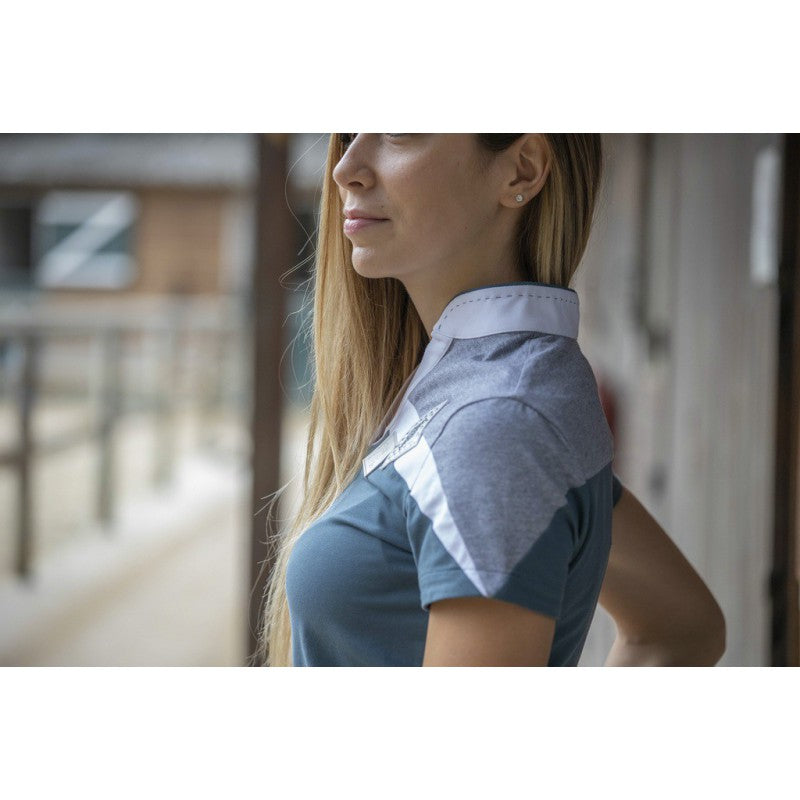 Indy Poloshirt - ein neues Poloshirt von Penelope, das Sie nicht verpassen sollten! Indy hat einen Ethno-Look, der etwas Neues ist und dem Shirt einen besonderen Reiter-Look verleiht. Es kommt mit einem kurzen Stehkragen, der durch Zier-Stiche erhöht wird, einem schön geformten V-Ausschnitt und einem süßen, femininen Schnitt. Der superweiche Stoff macht es sehr angenehm zu tragen. Damit ist es das perfekte Polo zum Reiten, Chillen im Stall oder in der Stadt.