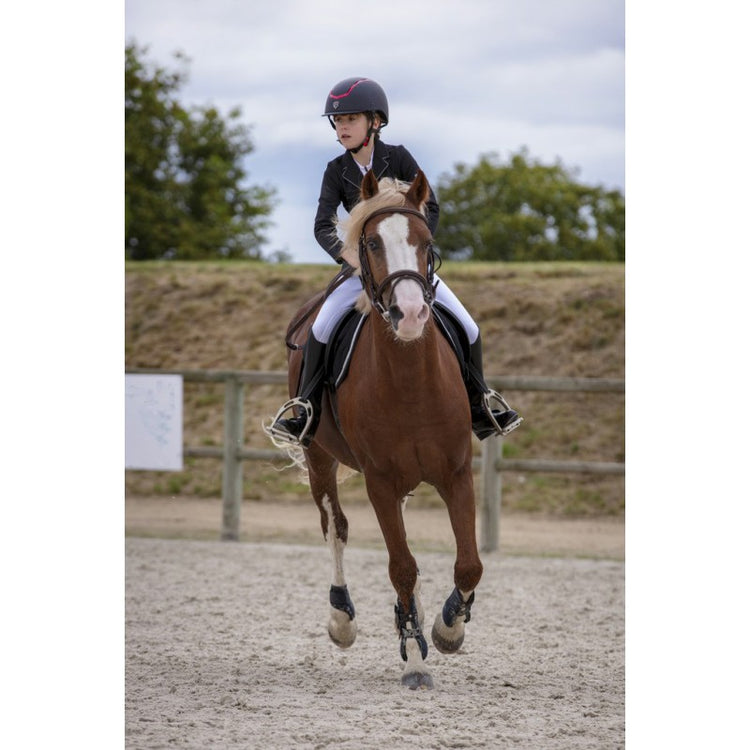 Equi-Théme Kinder Turnierjacket „Soft Classic“ – atmungsaktives, wasserabweisendes und winddichtes Polyester-Softshell mit polarfleeceartig gebürsteter Innenseite für den Einsatz in der Übergangs-/Kaltsaison. Eng anliegende, anatomische Verarbeitung, Nähte an den Ellbogen für absolute Bewegungsfreiheit auch bei Sprüngen und Schneiderei vorne und hinten, die mit doppelten flachen Schlitzen enden. Kontrastpaspeln an Kragen, Taschenklappen und Ärmelabschlüssen. Knopfverschluss, 2 Pattentaschen und 2 Schlitze auf der Rückseite der Jacke.