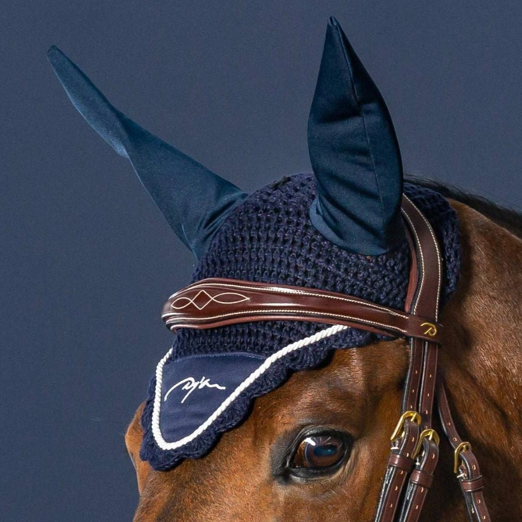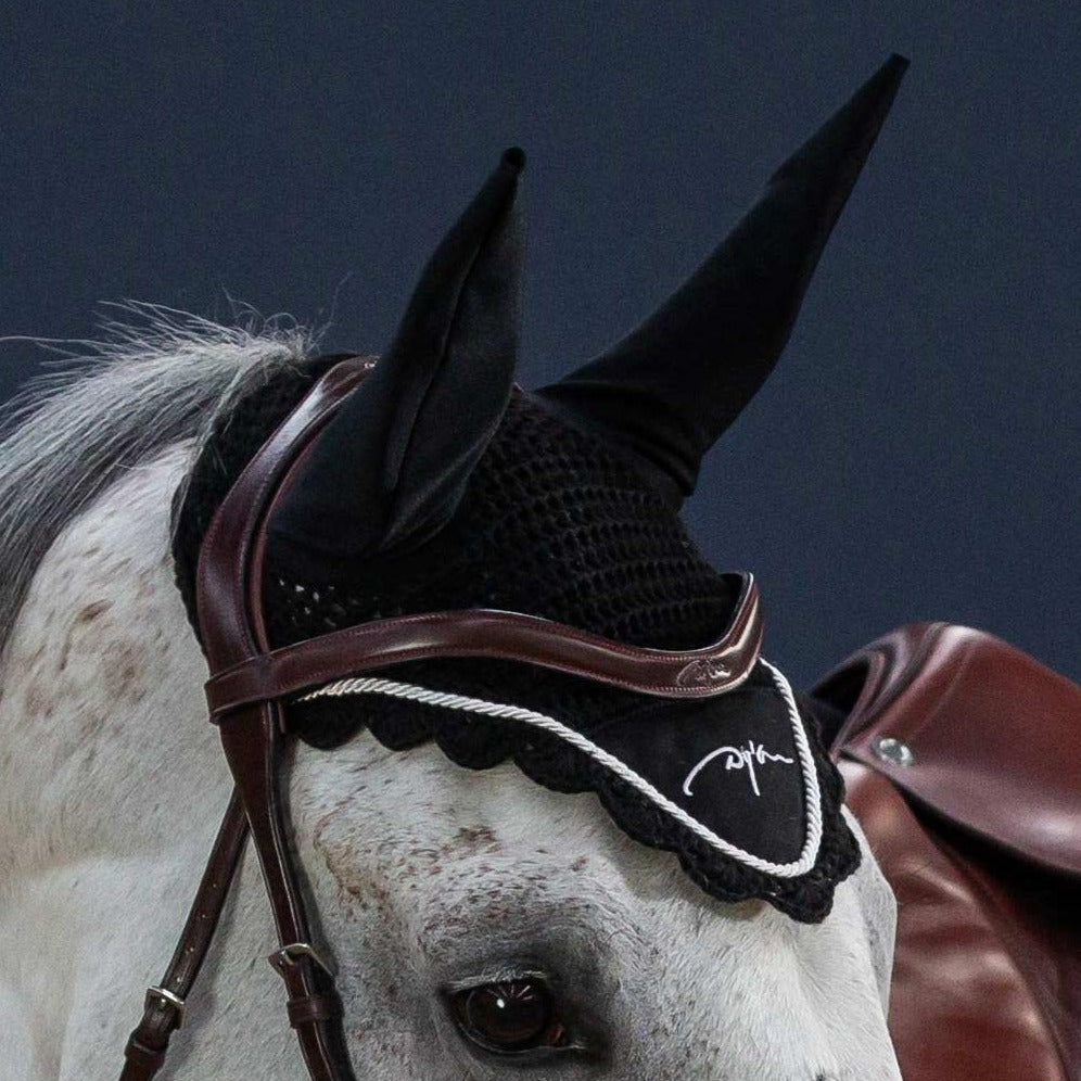 Bei jungen oder sehr empfindlichen Pferden empfehlen sich Fliegenhauben mit Lärmdämpfung. Der untere Bereich der Mütze ist etwas schwerer und liegt ruhiger, während die Ohren dicker abgepolstert sind. Natürlich kann das Pferd noch hören, was um es herum passiert, der Turnierlärm ist aber nicht mehr so intensiv und einfacher zu verarbeiten.