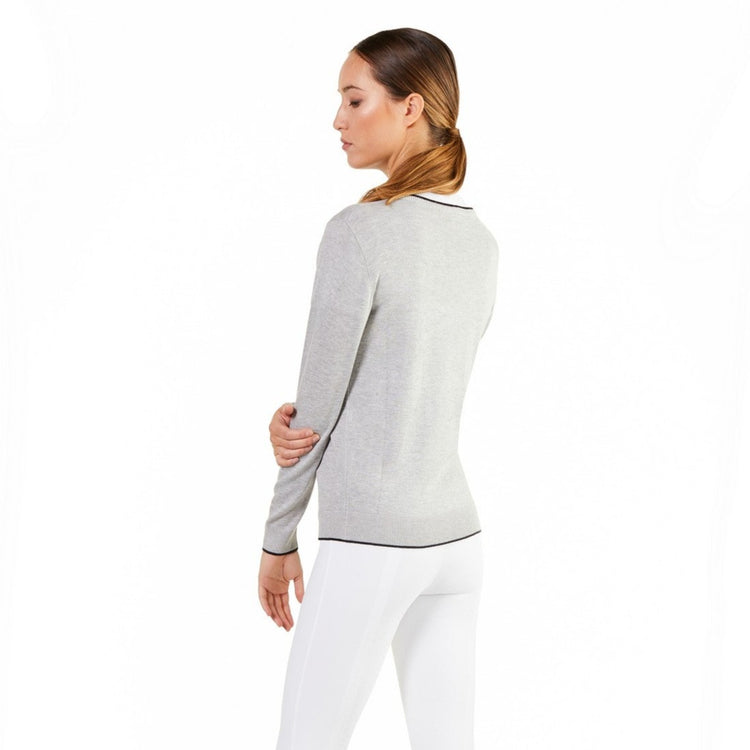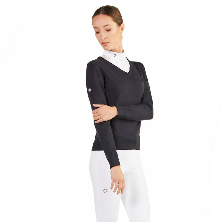 Ego7 Damen-Pullover mit V-Ausschnitt – dieser elegante Damen-Strickpullover hat eine federartige Textur und einen eleganten Stil. Das verwendete Luxusmaterial besteht aus umweltfreundlichen Garnen und fühlt sich seidig und frisch an. Perfekt zum Aufwärmen, nach der Fahrt als glamouröse Einlage zum Kuscheln! Wenn Sie es über Ihre EGO7-Wettkampftrikots ziehen, ist es eine perfekte modische Ergänzung. Am Arm ist ein Ego7-Pferdekopf-Logo auf einer Metallplakette angebracht. Kontrastfarbene Säume und ein Jacquard-Logo auf der Brust unterstreichen Ihren Stil und Ihre Leidenschaft. Dieser vielseitige Pullover ist für alle Jahreszeiten geeignet.
