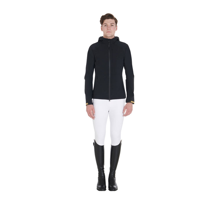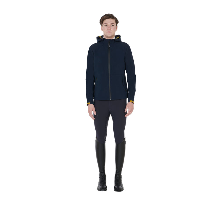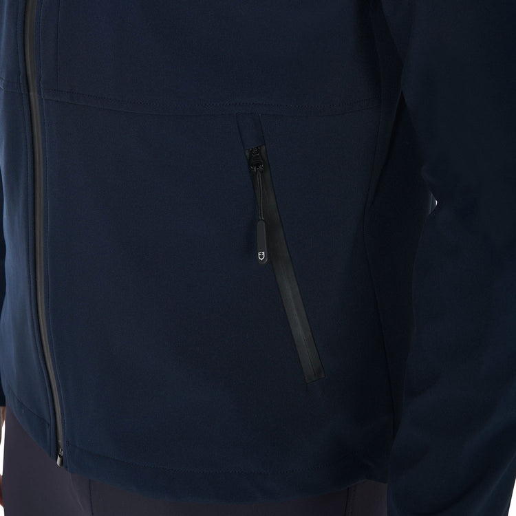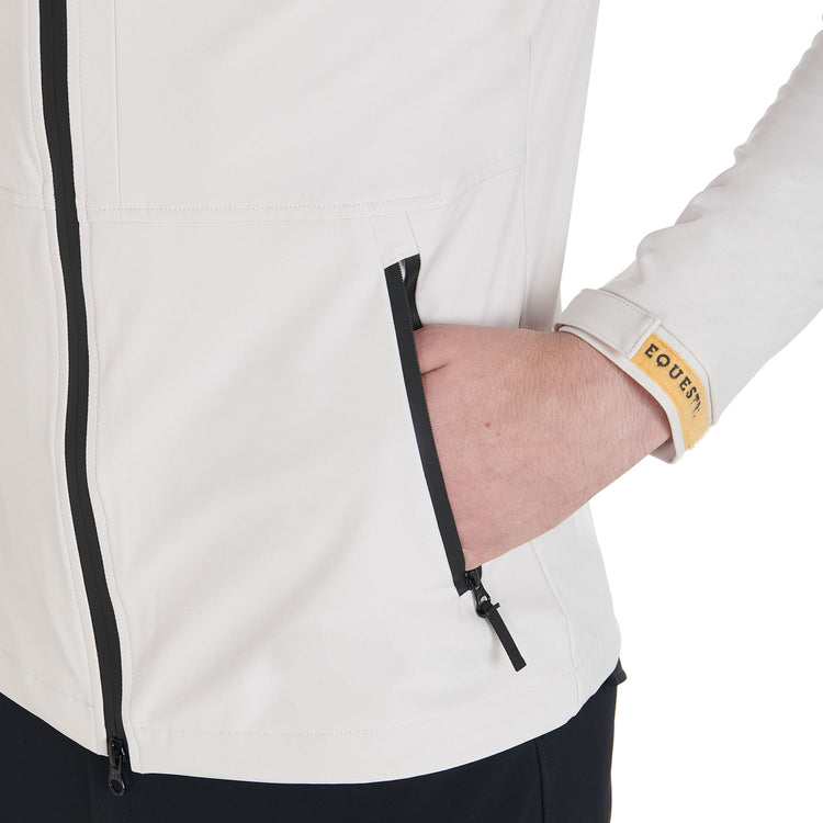 Equestro Herren Softshell Jacke - diese sportliche Herren-Reiterjacke besteht aus atmungsaktivem und antibakteriellem Funktionsgewebe, um maximalen Komfort beim Reiten und im Stall zu gewährleisten. Die Jacke bietet eine perfekte Passform und verfügt über eine Kapuze, verstellbare Handgelenkriemen und einen Zwei-Wege-Frontreißverschluss. Equestro-Logos an den Handgelenken sowie dem linken Ärmel verleihen der Jacke einen tollen Look.
