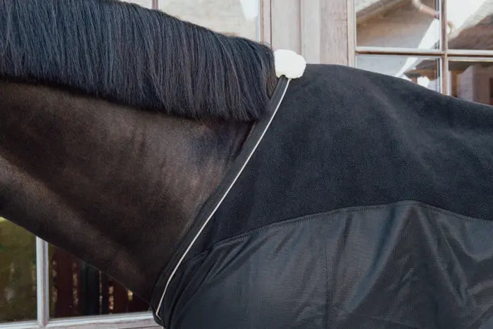 Darüber hinaus ist diese Decke auf der Rückseite anatomisch geformt, damit sie sich gut an die Form Ihres Pferdes anpasst. Das vegane Schaffell am Widerrist sorgt für zusätzlichen Komfort und Schutz vor Scheuerstellen.