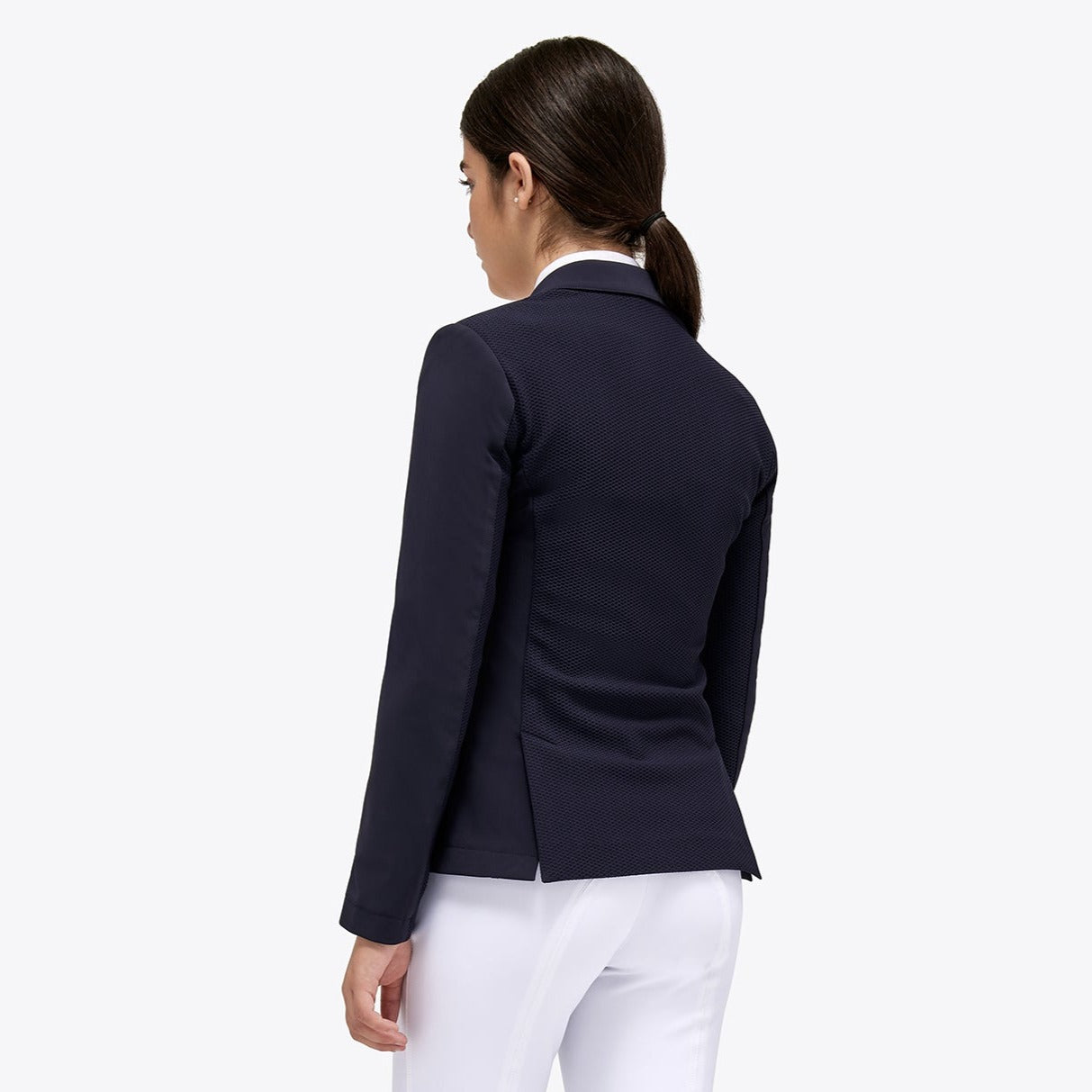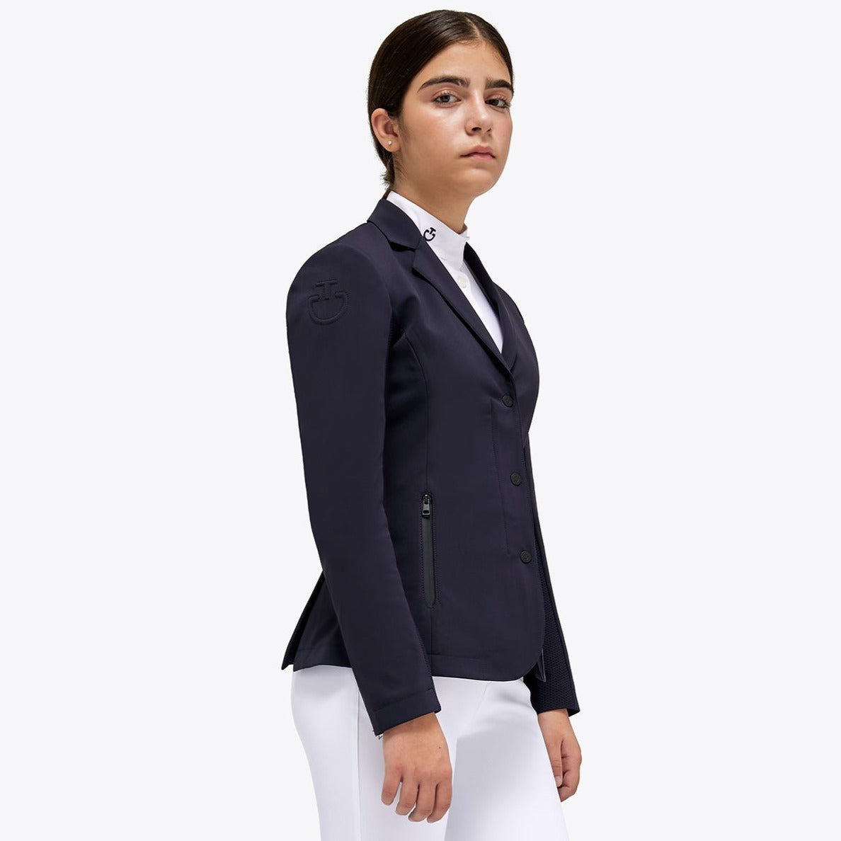 Cavalleria Toscana Mädchen Turnierjacke – eine klassische und schicke Turnierjacke für die jungen weiblichen Reiterinnen von Cavalleria Toscana. Es hat eine kleine, figurbetonte Form und einen maßgeschneiderten Schnitt, der wunderbar passt. Die Rückseite der Jacke sowie die Unterseite der Ärmel bestehen aus Mesh-Material, das eine hohe Atmungsaktivität für höchsten Komfort beim Turnier gewährleistet. Der dehnbare technische Jerseystoff ermöglicht Bewegungsfreiheit, die matten Druckknöpfe mit CT-Logo verleihen der Jacke einen luxuriösen Look, während der versteckte Reißverschluss hinter den Knöpfen dafür sorgt, dass die Jacke immer sitzen bleibt und sich dem Körper anpasst. Das klassische Design mit dem CT-Logo auf dem Ärmel verleiht ihm den schicken italienischen Look. Außerdem verfügt es über zwei Taschen mit thermogeklebten Reißverschlüssen, die ihm einen technischen und modernen Touch verleihen. Es ist definitiv ein wichtiger Teil eines Siegerstils, den eine junge, ambitionierte Reiterin nicht missen möchte!