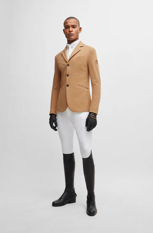 Boss Equestrian Herren Turnierjackett Allen – Ein stylisches Herren Reitjackett mit Gunmetal-Knöpfen und perfektem Schnitt. Hergestellt aus ultraleichtem, hochwertigem Stretchmaterial bietet die Jacke eine ausgezeichnete Passform sowie uneingeschränkte Bewegungsfreiheit beim Reiten und Wettkampf. Ein Boss-Logo-Patch am linken Ärmel sowie die charakteristische Streifenflagge am Kragen verleihen den unverwechselbaren Boss-Look. Die Jacke ist Freejump Airbag-kompatibel und kann mit einer Freejump Airbag-Weste darunter getragen werden. Eine hervorragende Jacke in einer einzigartigen Farbe für den Springparcours.