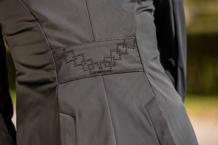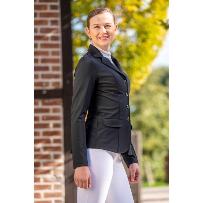 HKM Damen Turnierjacket -Aurora- - dieses stylische und elegante Jacket besteht aus einem atmungsaktiven Material, welcher verhindert, dass Sie massiv schwitzen. Durch die Knitterfestigkeit bleibt diese Turnierjacke perfekt in Form. Darüber hinaus garantieren der elastische Stoff und die Rückenschlitze absolute Bewegungsfreiheit und Komfort. Die kleinen Kristalldetails an den beiden Taschen sorgen für einen sehr schicken und modernen Look. Hinter der Knopfleiste befindet sich ein Reißverschluss für einen noch sichereren Verschluss.