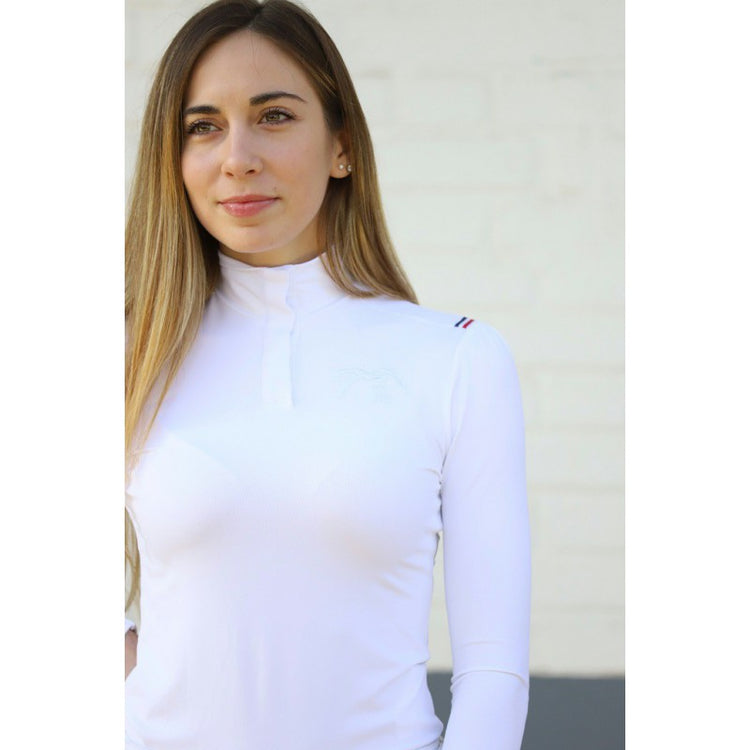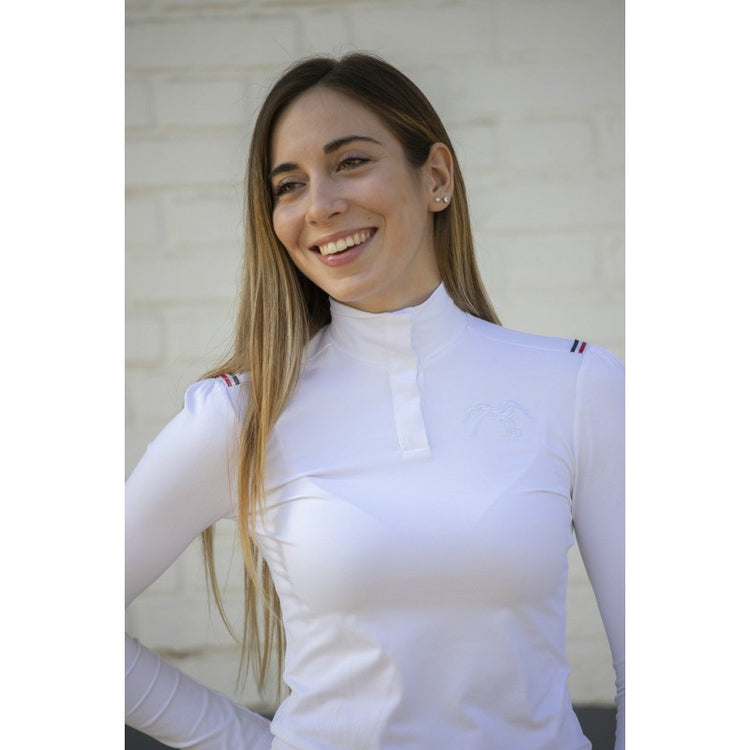 Penelope Bruges Langarm Turniershirt - Das langärmelige Turniershirt, das mit einem klassischen Look und tollen Details überzeugt. Das weiße Shirt mit Kragen vereint alles, was Sie an einem Turniertag brauchen - ein klassisches weißes Shirt, mit blauen und roten Details entlang der Schultern und Manschetten, sowie kleinen französischen Flaggen auf Schultern und Manschetten. Darüber hinaus ergänzt die Ton-in-Ton-Stickerei des PC-Logos die Gesamtoptik des Shirts. Ein Shirt für den Sieg.