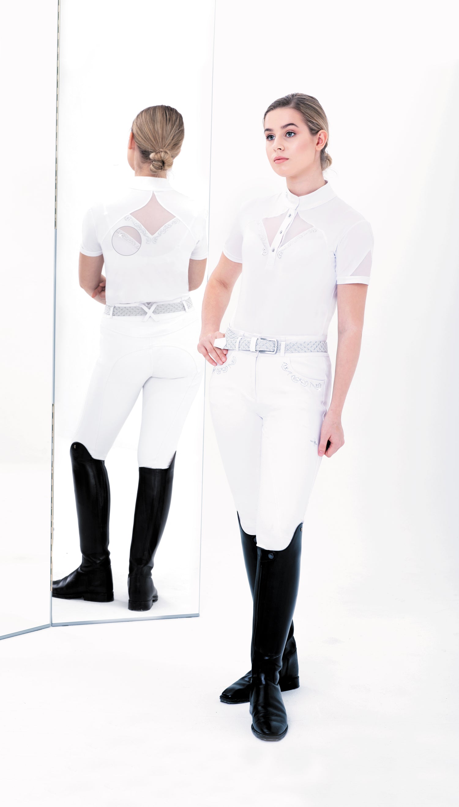 Turniershirt Cathrine - ein edles Shirt mit wunderschönen Kristall-Applikationen auf der Vorder- und Rückseite und glänzenden Knöpfen auf der Vorderseite. Als perfekte Kombination aus elegantem und sportlichem Stil bietet dieses Turniershirt sowohl eine großartige Leistung als auch ein hervorragendes Aussehen.