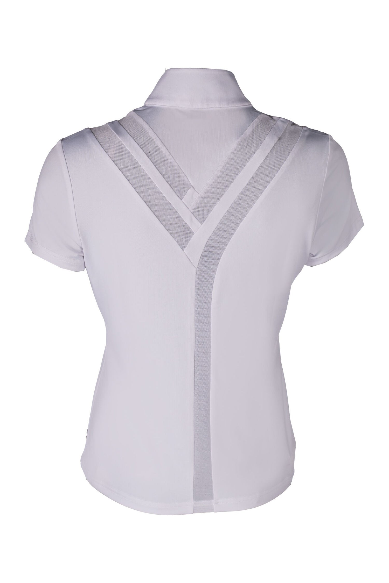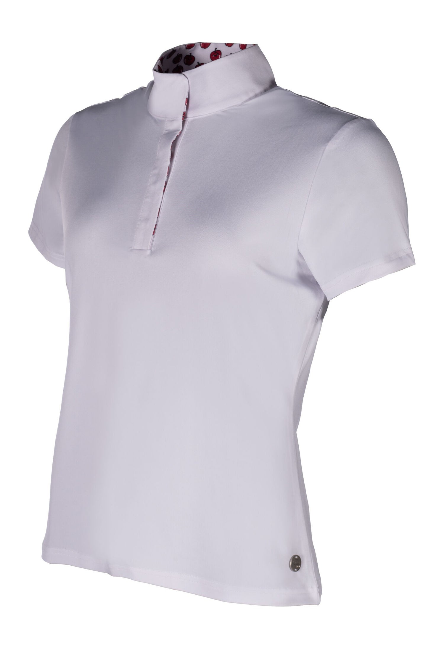 Mesh-Einsätze verbessern die Belüftung und halten den Reiter auch unter einer Turnierjacke frisch. Ein eleganter Stehkragen unterstreicht den gepflegten Turnierlook, während ein dekorativer Kirschdruck im Krageninneren eine spielerische, stilvolle Note hinzufügt. Mit seiner Kombination aus technischer Leistung und eleganten Details ist das Hunter Kurzarmshirt eine verlässliche Wahl für Turniertage.