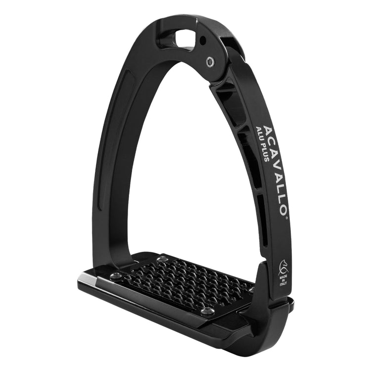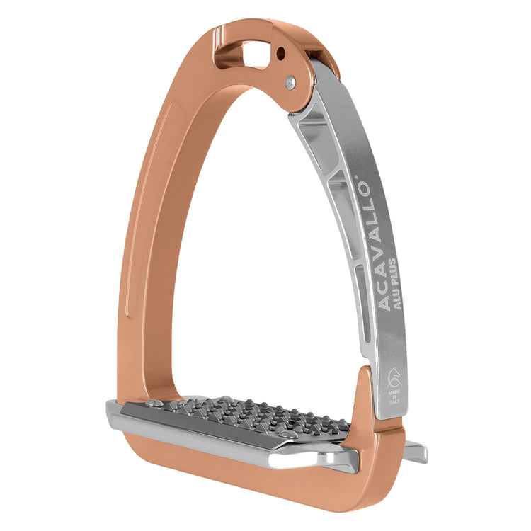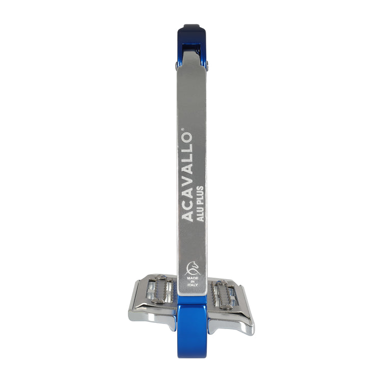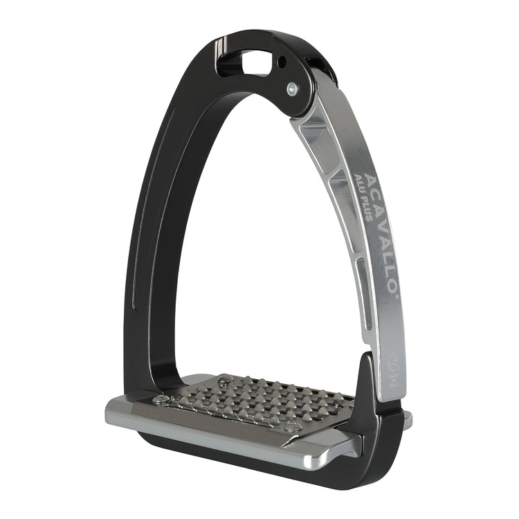 Arena Aluplus Aluminium Safety Stirrups - ein neues Premium-Modell der von Acavallo patentierten, seitlich öffnenden Arena-Bügel, komplett aus zertifiziertem, hochwertigem, eloxiertem Aluminium gefertigt und versehen mit einer Trittfläche aus Edelstahl. Acavallo hat die verwendeten Materialien nach eingehender Forschung und umfassenden Tests sorgfältig ausgewählt und kombiniert. Das Aluminium verleiht dem Steigbügel nicht nur ein schlankes und elegantes Aussehen, sondern ist auch leicht und extrem haltbar, während der rostfreie Stahl die Trittfläche vor Korrosion schützt und somit eine lange Lebensdauer des Produkts garantiert. Die Öffnung des spannungsbetätigten Ver- und Entriegelungsmechanismus ist einen Zentimeter höher als die Trittfläche angebracht, um sicherzustellen, dass der Fuß nicht versehentlich seitlich herausrutschen kann, und um zu verhindern, dass Sand und Schmutz im Notfall den Öffnungsvorgang des Arms verzögern. Langlöcher in der Trittfläche verhindern Sand- und Schmutzansammlungen, so dass die Griffigkeit nicht beeinträchtigt wird. Eine Neigung der Trittfläche um fünf Grad hilft dem Reiter, die richtige Haltung einzunehmen und entlastet Knöchel, Waden, Knie und Hüfte.