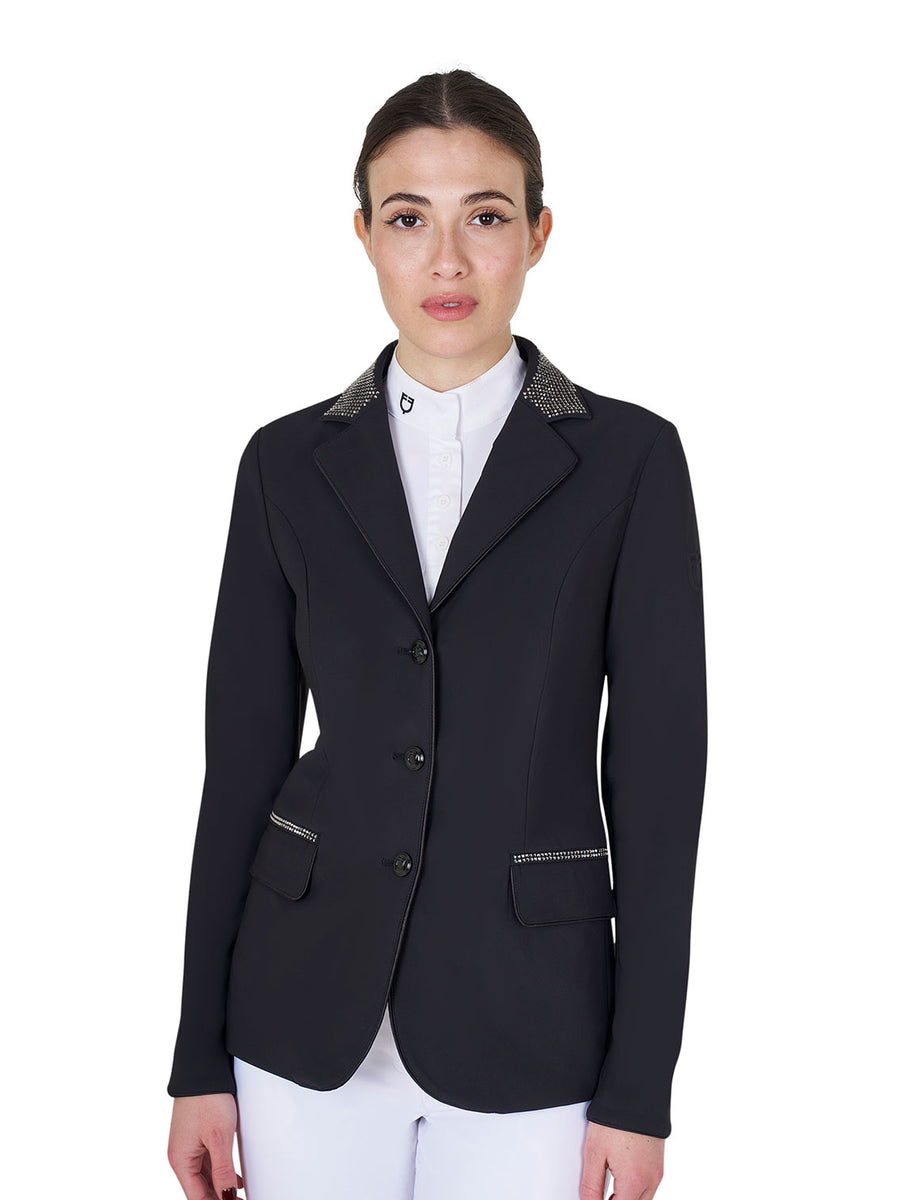 Der klassische, taillierte Schnitt betont die feminine Silhouette und bietet gleichzeitig uneingeschränkte Bewegungsfreiheit im Sattel. Funkelnde Strassdetails an Kragen, Rücken und Fronttaschen verleihen der Jacke eine edle Ausstrahlung und sorgen für einen eleganten Auftritt – sowohl im Wettkampf als auch bei der Siegerehrung. Der Dreiknopfverschluss vorne sowie an den Manschetten rundet das anspruchsvolle Design harmonisch ab, während seitliche Pattentaschen Funktionalität und Stil vereinen.