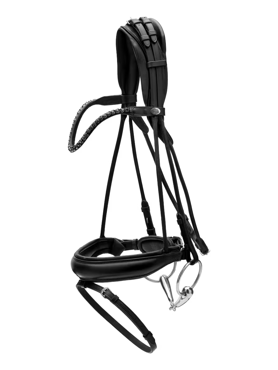 Die rundgenähte Verarbeitung verleiht der Trense eine klassische, luxuriöse Dressuroptik. Der V-förmige Stirnriemen mit grauen Swarovski Kristallen setzt einen dezenten, eleganten Akzent. Das anatomische S-förmige Genickstück entlastet den empfindlichen Bereich hinter den Ohren und sorgt für mehr Bewegungsfreiheit und Komfort.