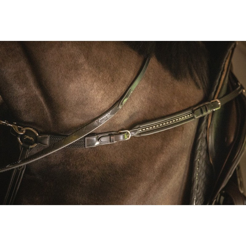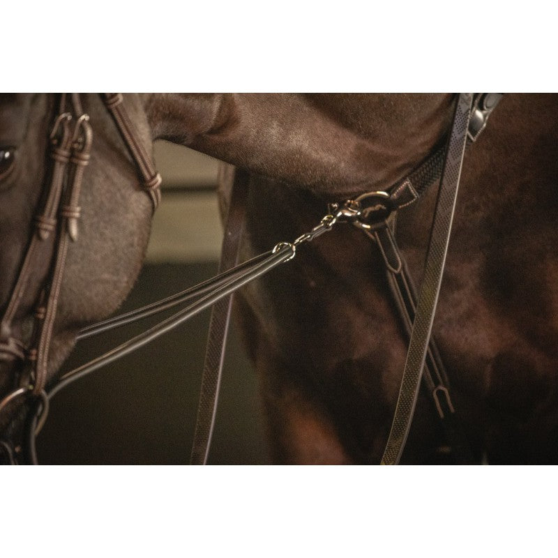 Penelope Collection Howlett Training Aid - also known as a German martingale, the Howlett Training Aid is compatible with the Martin Collar and the Howlett Reins. It needs to be hooked to the central ring of the Martin Collar. Designed to help the horse work the muscles of their spine, and allowing both the horse and rider to be in the correct position with the right amount of contact as the action is only on the reins. When the horse gives way, the Howlett Training Aid also gives way, eliminating the nuisance of the rider's hand. It therefore limits the bad action of the riders' hands, ensuring the horse has improved contact.