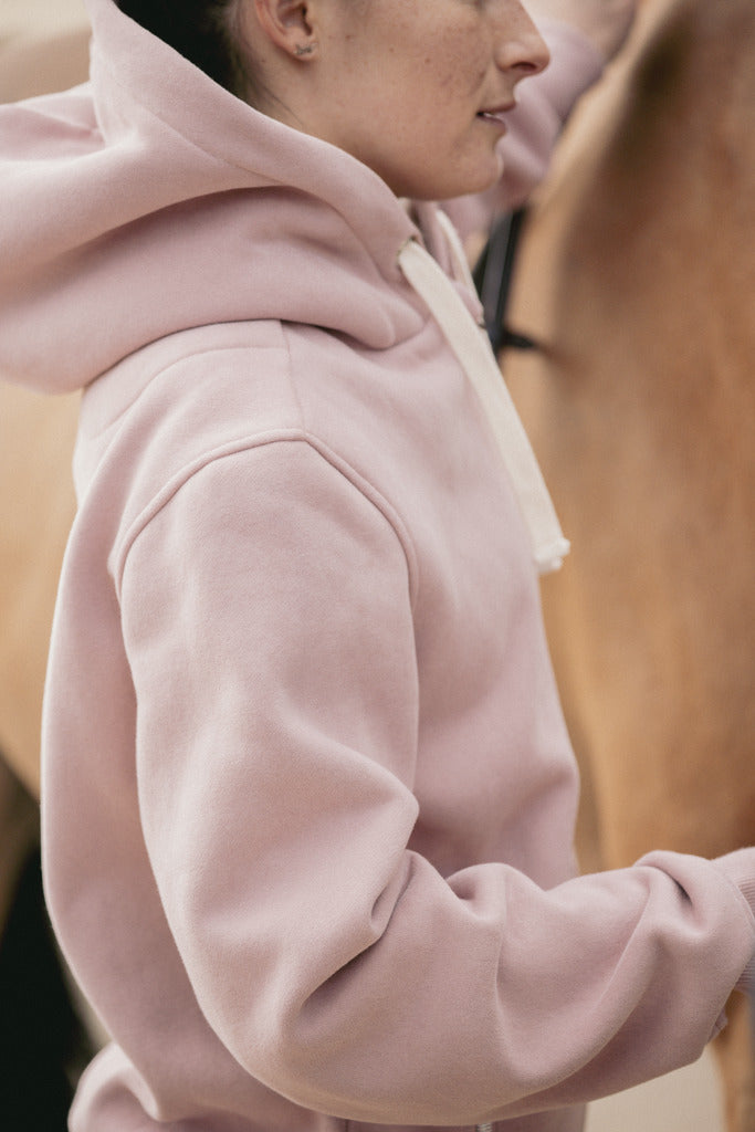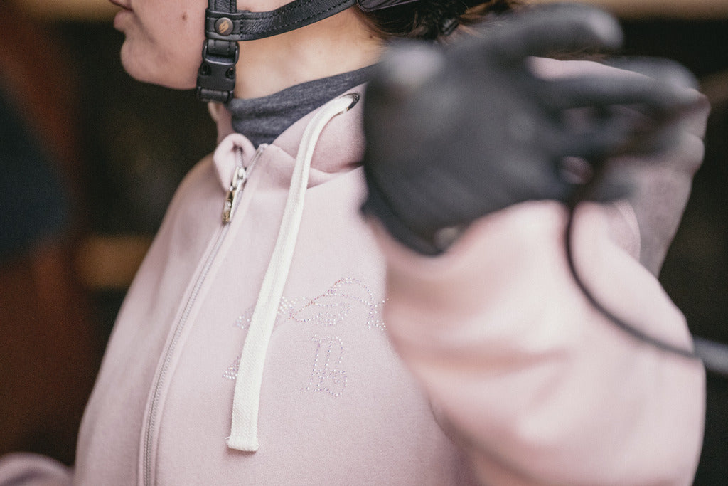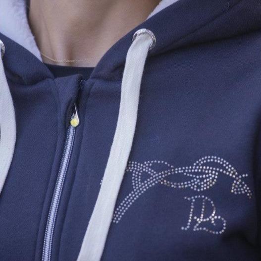 Penelope Collections Women's Sweatshirt Tressy - a zipped hoodie that will keep you warm and comfortable in and out of the stable. This pretty sweater has a large hood lined with very fluffy teddy fleece and wide drawstrings. It also has two practical front pockets with zippers so your personal belongings won't fall out during riding or other sports. A gorgeous Penelope logo in rhinestones on the chest makes this sweatshirt just perfect.