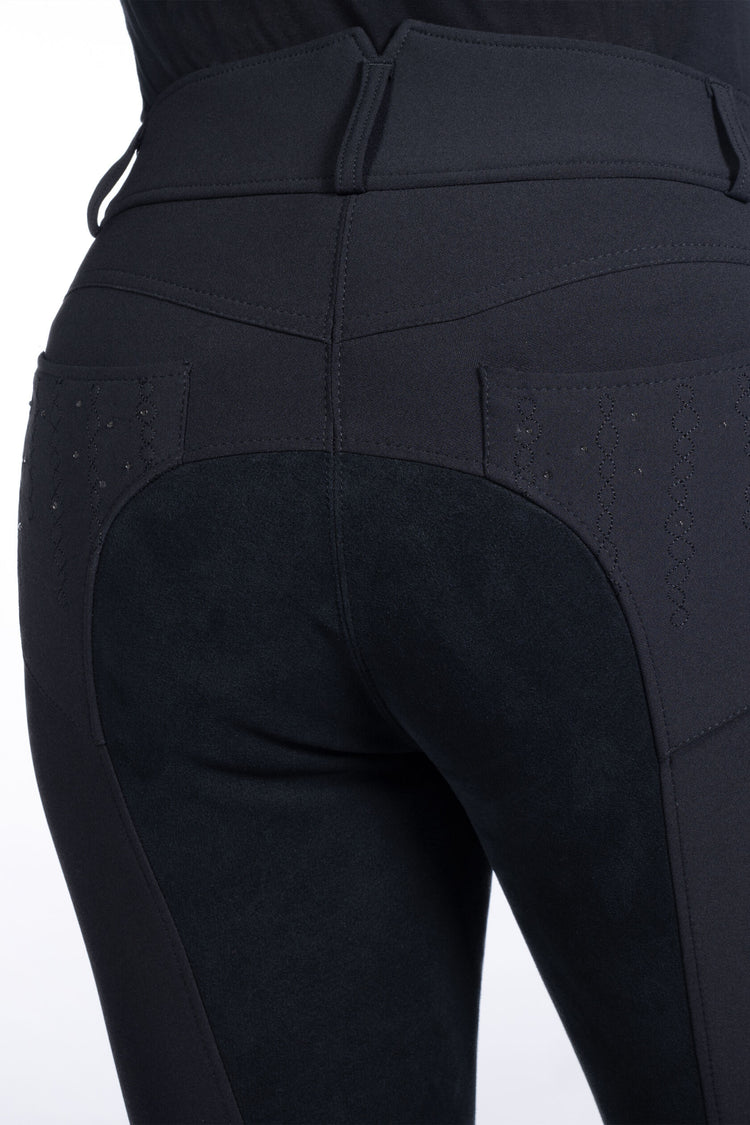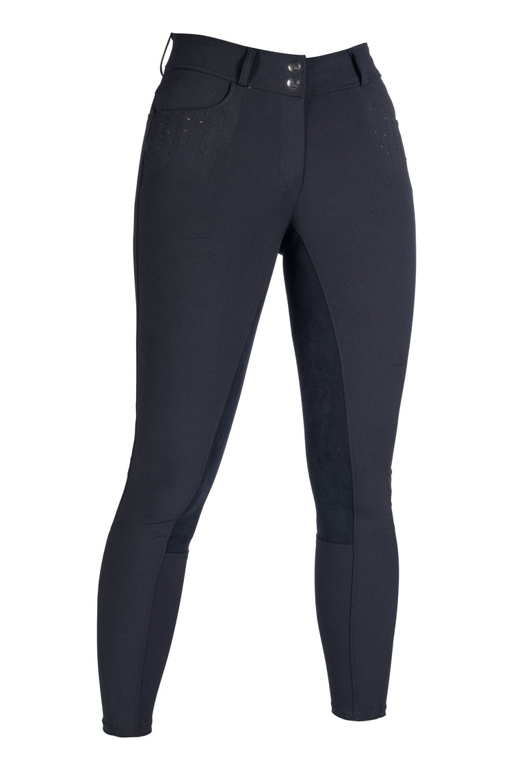 HKM Style Riding Breeches Savona Style with Alos Full Seat - ride in style and comfort with these classic women's full seat breeches from HKM. Always popular with dressage riders thanks to their faux leather full set, the breeches feature elegant crystal decorations on the pockets and have a high-rise for ultimate comfort and a perfect fit. The bi-elastic fabric allows complete freedom of movement in the saddle and is dirt resistant to help keep you looking your best. Large belt loops allow you to wear your favorite belt when riding.
